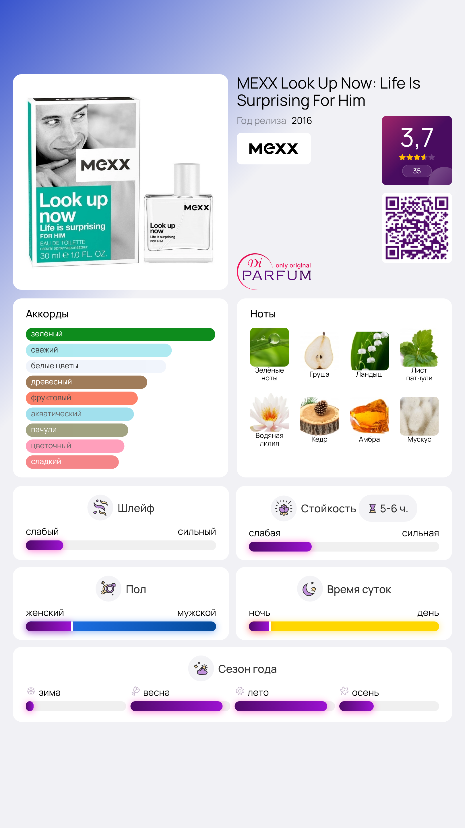 В начальных нотах этого аромата звучат яркие зеленые акценты, дополненные сладостью спелой груши. В сердце композиции водяная лилия и ландыш раскрываются на фоне пачули, придавая глубину. Базовые ноты состоят из классических ингредиентов, знакомых всем, таких как амбра, мускус и белый кедр.