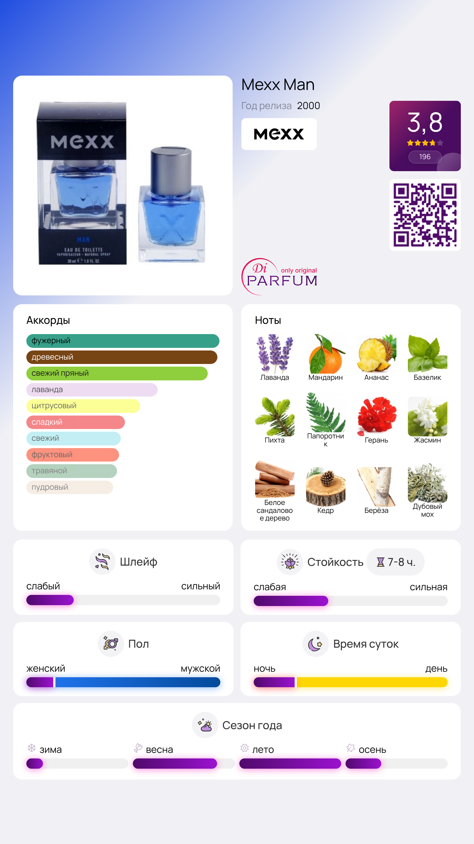 Первоначально Mexx for Man впечатляет пряно-свежими нотами, дополненными изысканными цветочными акцентами и легкой нотой шалфея. В сердце аромата слышны ароматы сосны, папоротника, герани и жасмина, а завершает композицию древесные ноты кедра, березы и дубового мха, создавая запоминающийся и стойкий шлейф.