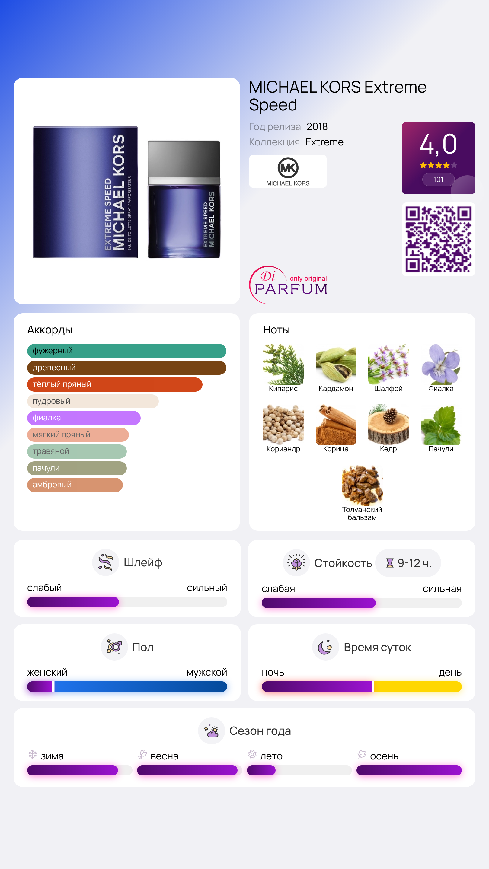 Экстремальная скорость – это крайне рискованно, но при этом манит тех, кто ищет острых ощущений! Чтобы снизить риски, но добавить своему стилю динамичность и спортивную элегантность, дизайнер Michael Kors предлагает попробовать новый парфюм Extreme Speed. Этот аромат стал частью известной коллекции Extreme и дополнил разнообразие древесных пряных композиции.