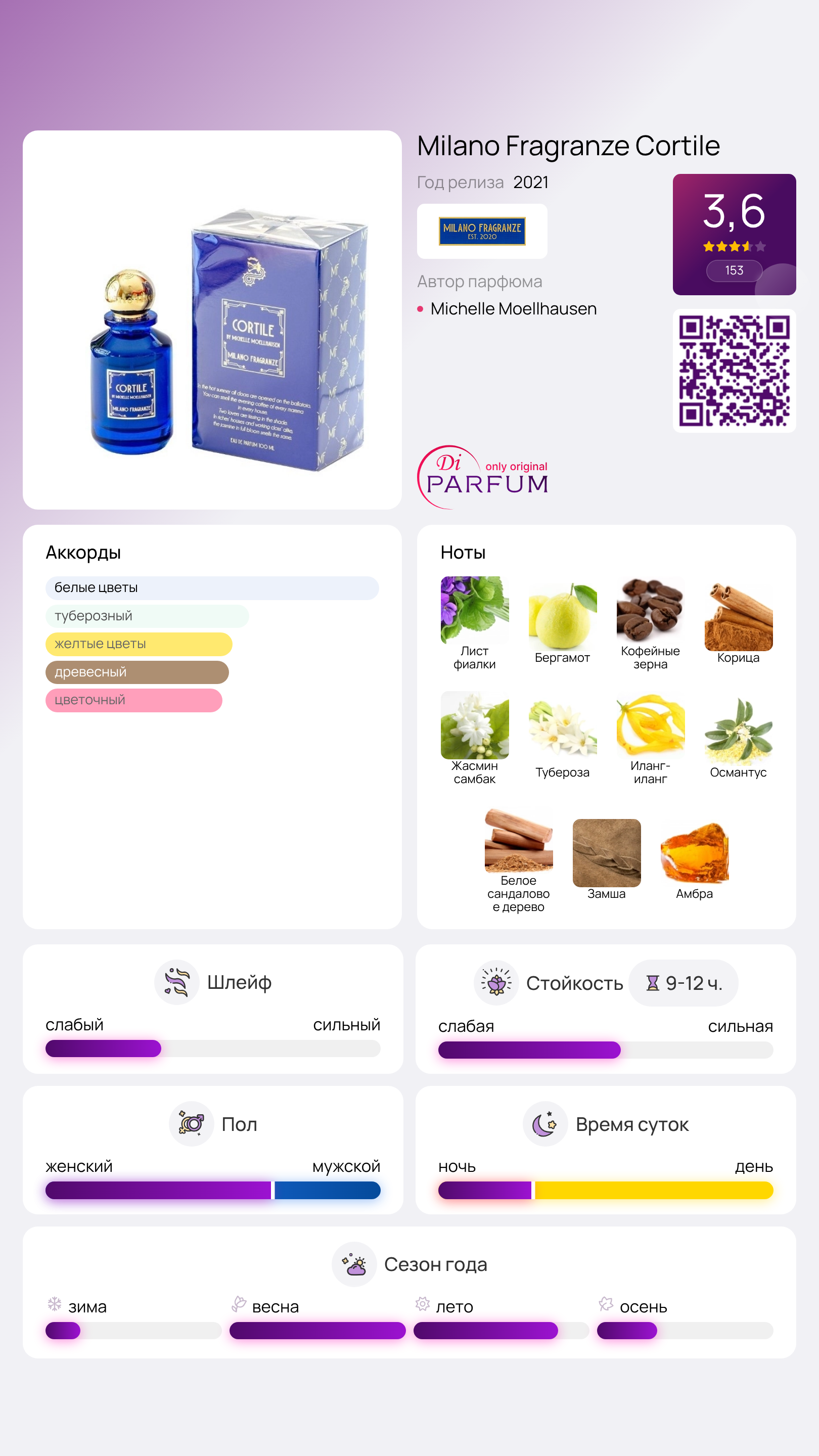 Виртуозные цитрусовые акценты бергамота и корицы служат фоном, а бархатный шлейф, созданный из теплой замши, солнечной амбры и молочного сандала, завершается чувственным финалом. Парфюм Cortile от Milano Fragranze стал символом тусовочных улиц Милана. Коллекция Masque Milano, в честь этого исторического города и его культурного наследия, включает восемь ароматов. Данная парфюмерная вода была выпущена итальянским брендом в 2021 году.