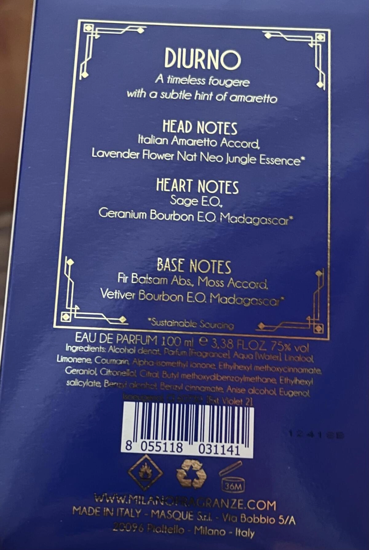 Аромат начинается с яркой композиции, в которую входят ароматная лаванда и сладость миндаля амаретто — традиционного итальянского ликера. Весенний бурбонский герань и свежий шалфей создают гармоничный и приятный союз. Шлейф аромата охватывает кожу нежным белым мускусом, а освежающие водные ноты дополняются хвойным кедром. Diurno был представлен в 2021 году как часть коллекции, посвященной духу и культуре миланских мест и жителей.