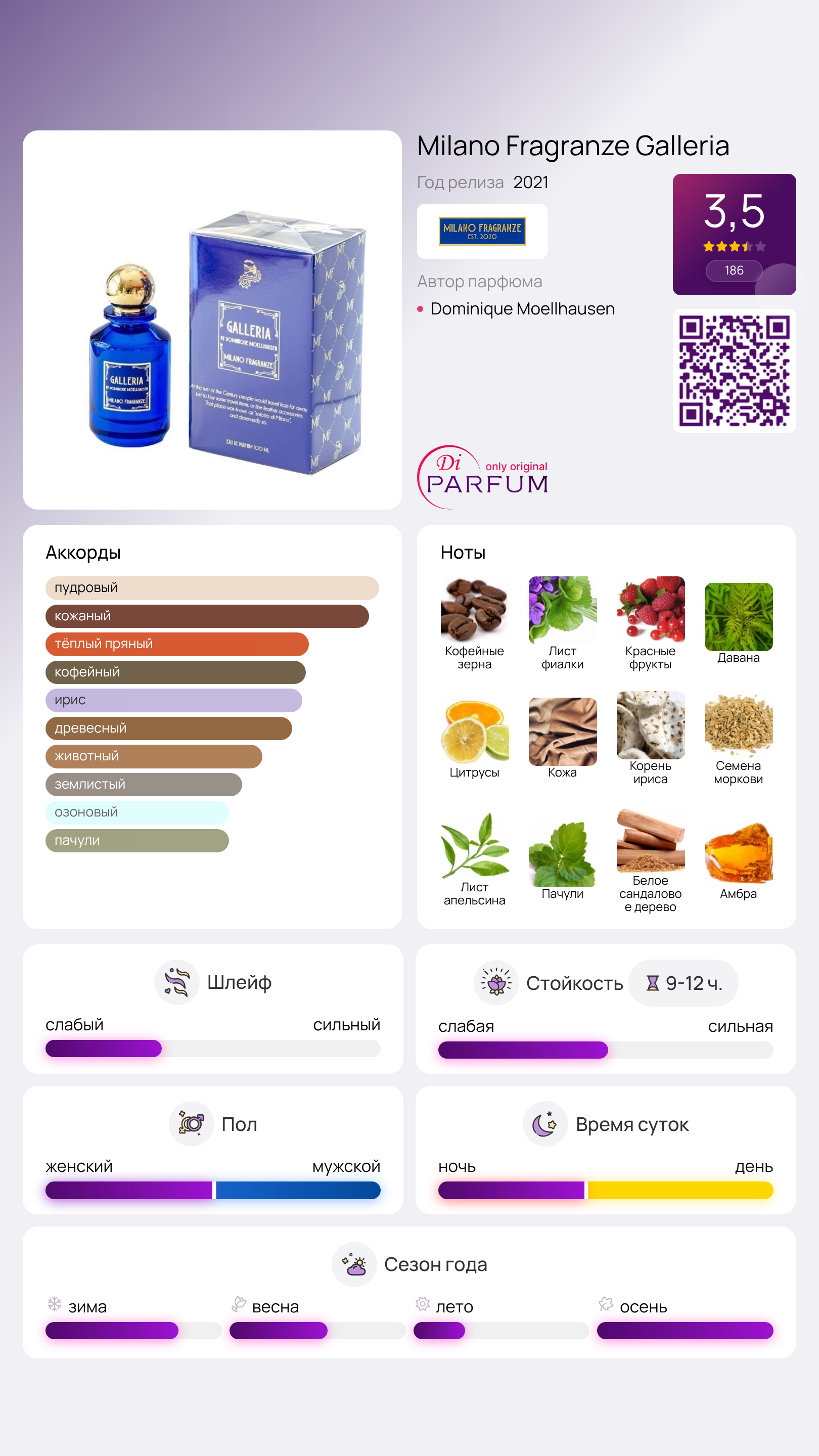 В восхитительном шлейфе ощущаются томные пачули и янтарная амбра, смягченные сливочным сандалом. Базовые ноты напоминают о запахе кожаного ремешка. Композиция Galleria от Milano Fragranze стала настоящей жемчужиной коллекции Masque Milano, выпущенной в 2021 году. Она включает восемь ароматов, вдохновленных знаменитостями и достопримечательностями Милана. Несмотря на современность, эти духи глубоко впитывают культурные ценности города.