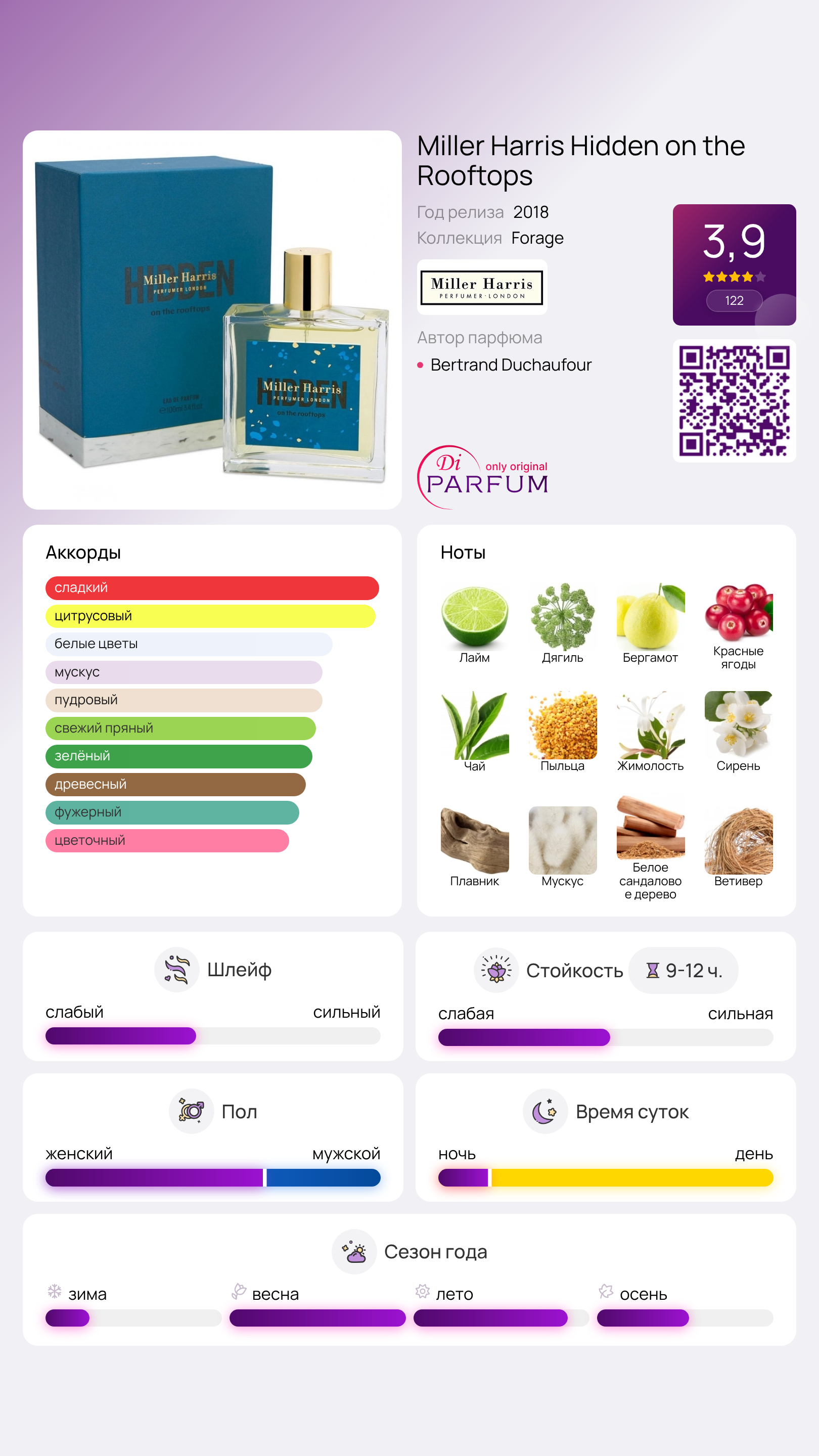 Месье Bertrand Duchaufour, безусловно, знает, как удивить своих фанатов и справедливо носит титул короля парфюмерного искусства. Его новая работа — унисекс аромат Miller Harris Hidden on the Rooftops. Название, звучащее довольно необычно и интригующе — "спрятанный на крыше", вызывает вопросы, но маэстро точно знает, о чем говорит. Этот запах настолько оригинален и уникален, что его следовало бы бережно хранить, как нечто священное.