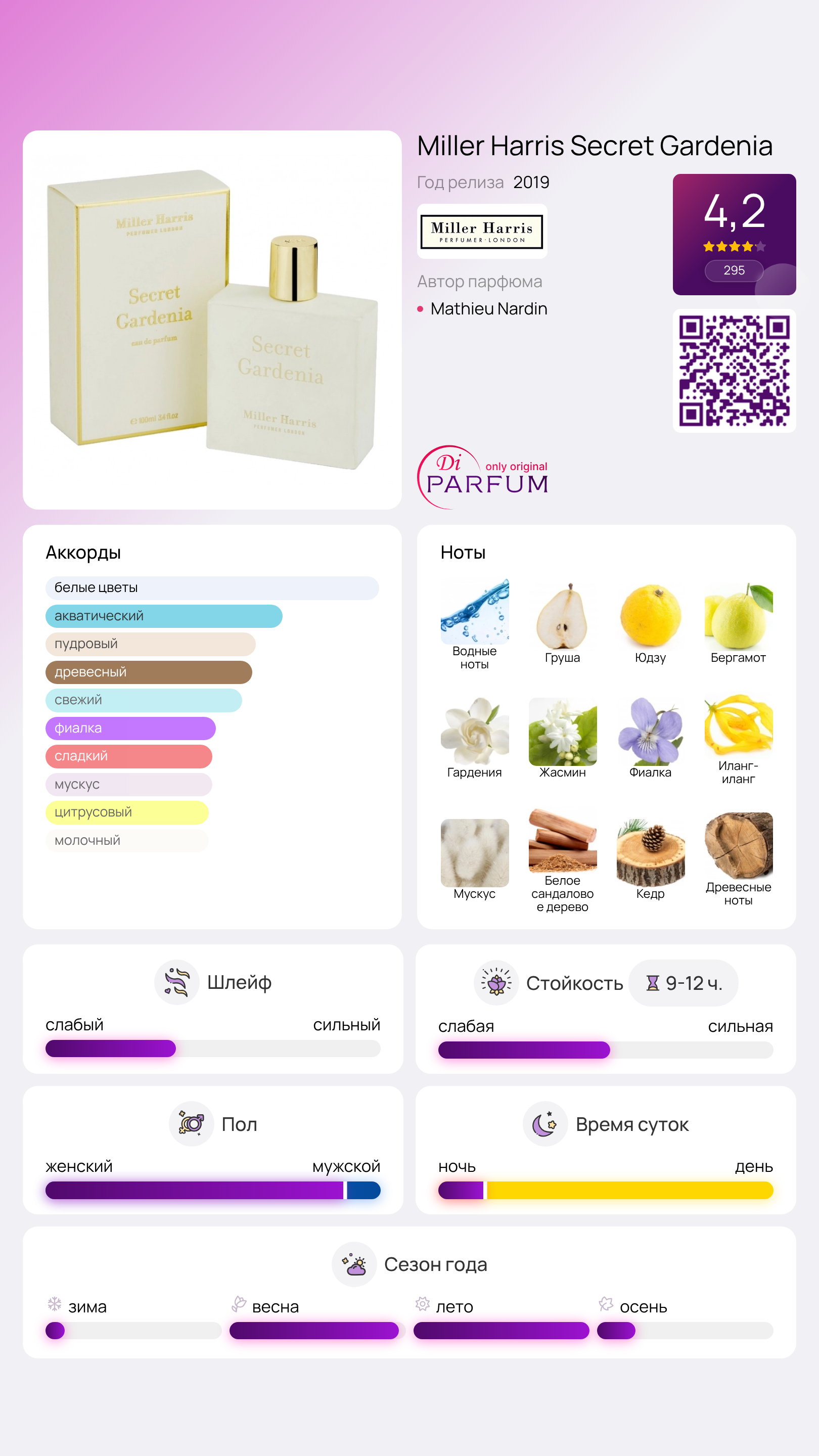 Secret Gardenia – это завораживающий, утонченный и чувственный аромат, созданный талантливыми специалистами известного британского бренда Miller Harris. Этот чудесный парфюм был представлен в 2019 году и стал частью изысканной коллекции цветочных ароматов. Его автор, французский парфюмер Мэтье Нарден, через этот запах передает тонкость и многогранность человеческой души, ссылаясь на хрупкость и элегантность цветка гардении, заключенного в элегантной светлой бутылке с золотыми деталями.