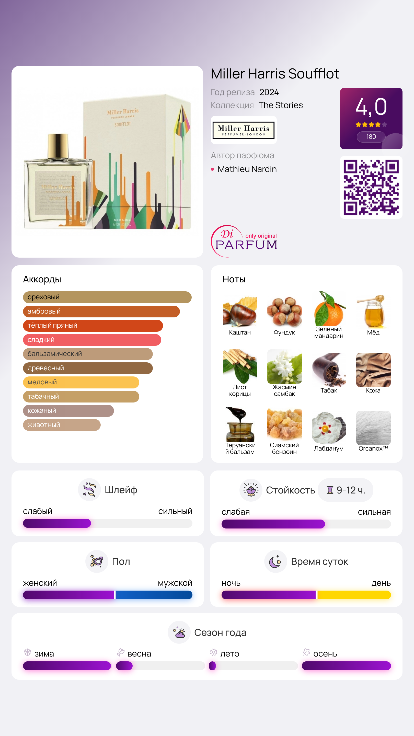 Soufflot от Miller Harris — это восточно-ванильный аромат, созданный для женщин и мужчин. Эта новинка была представлена в 2024 году, а автором композиции стал парфюмер Mathieu Nardin. Верхние ноты открываются ароматом каштана, лесного ореха и зеленого мандарина, переходя в сердце, наполненное медом, листом корицы и жасмином самбак. База аромата включает табак, кожу, бальзам Перу, бензоин, лабданум и ципреол.