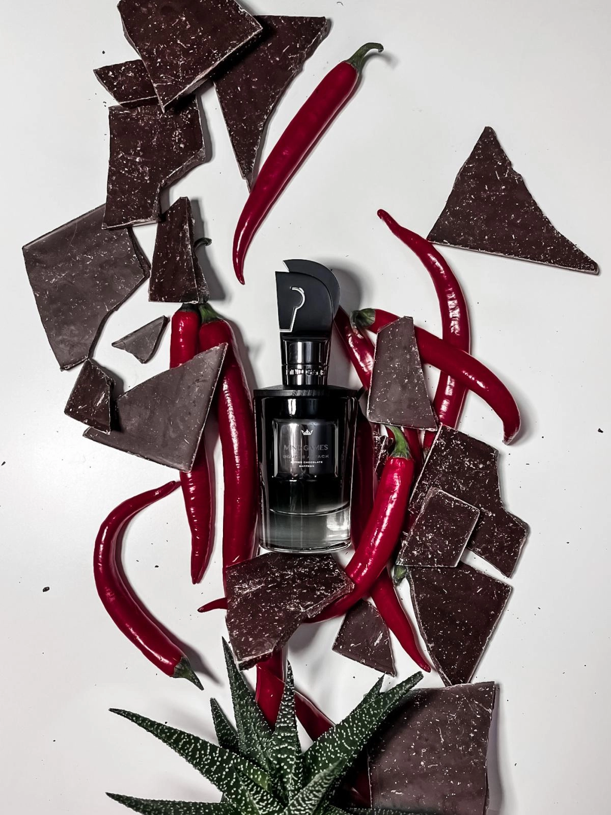 В верхних нотах звучит горький апельсин, придавая аромату свежесть и легкую кислинку. Затем к ним присоединяются пряные акценты красного и розового перца, а также согревающая корица, создавая неповторимое ощущение уюта и тепла. Ноты агава и герани добавляют цветочные оттенки, а темный шоколад привносит сладость и глубину, формируя необычайно притягательный букет.
