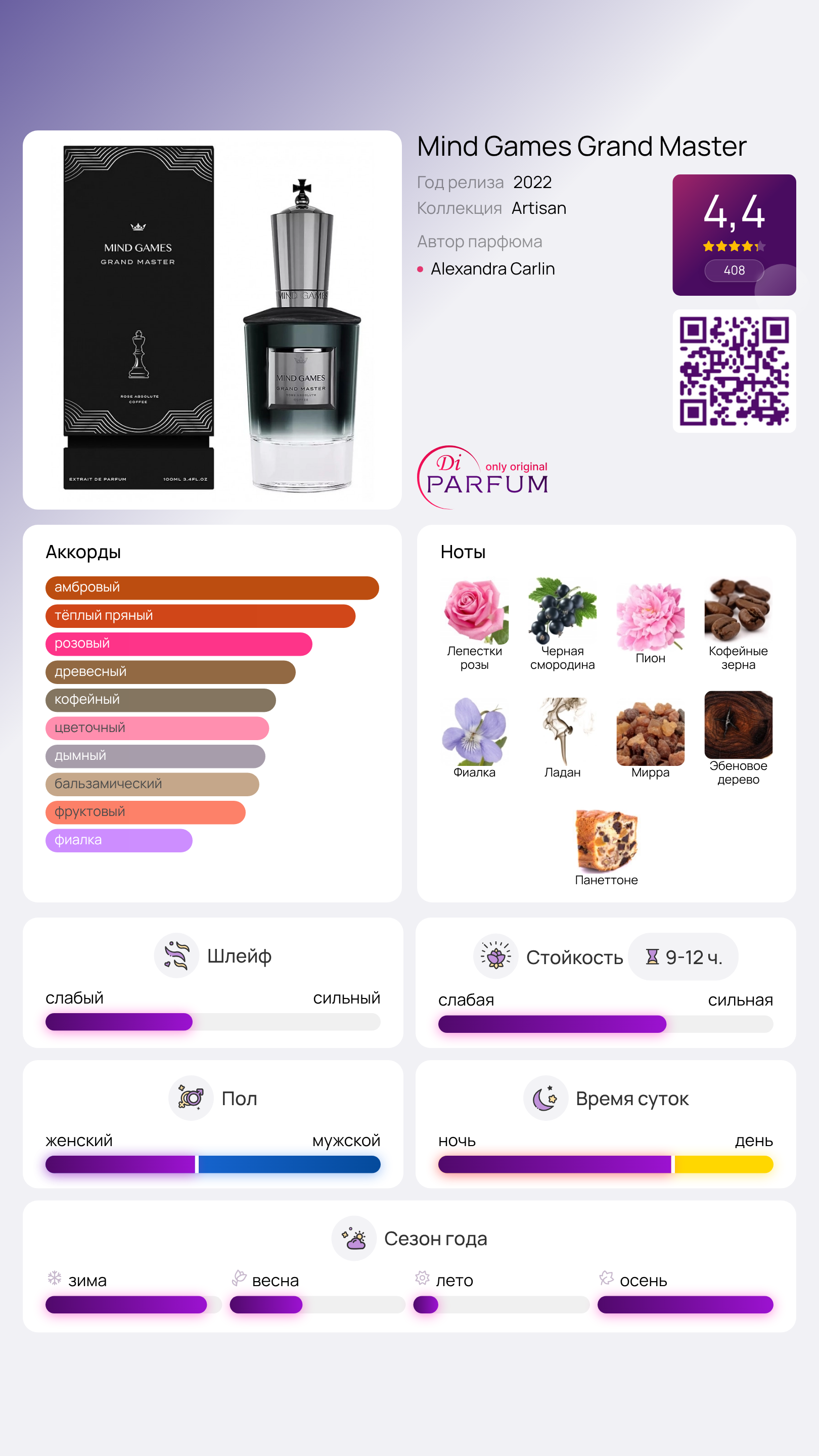 Grand Master от Mind Games — это унисекс аромат, который был представлен в 2022 году. Парфюмером данного произведения искусства является Александра Карлин. В верхних нотах раскрываются коктейли из Розовой воды, Черной смородины и Пиона; в сердце аромата звучат Майская роза, Кофе и Фиалка; в базе скрыты Ладан, Мирра, Эбеновое дерево и Панеттоне.