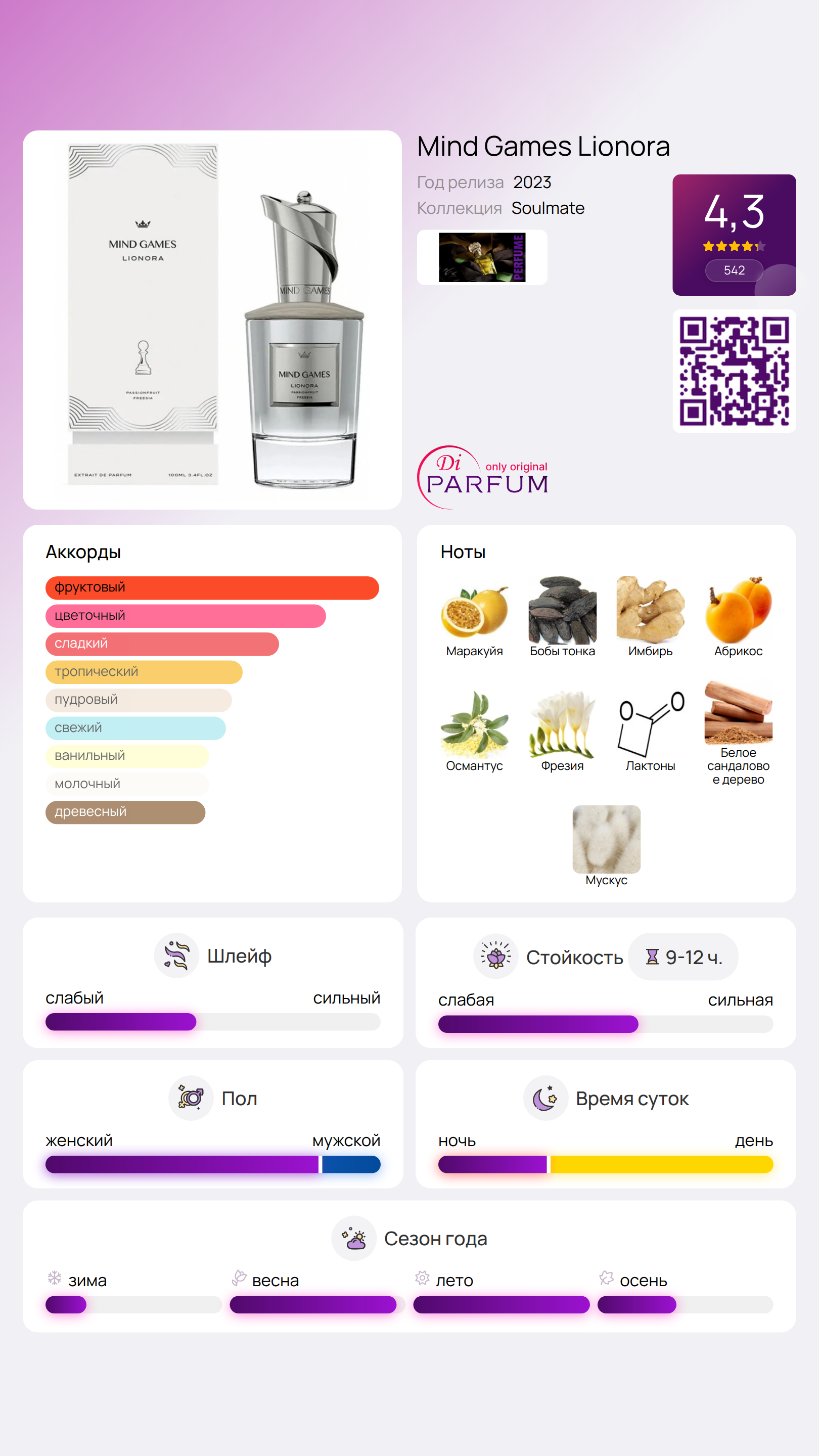 Lionora от Mind Games — это универсальный аромат, подходящий как для женщин, так и для мужчин. Запущенный в 2023 году, этот парфюм стал настоящей находкой для ценителей уникальных композиций. За создание аромата отвечает талантливый парфюмер Christelle Laprade. В его составе гармонично сочетаются верхние ноты маракуйи, бобов тонка и имбиря, которые плавно перетекают в сердечные ноты абрикоса, фрезии и османтуса. Завершает композицию мускус, сандаловое дерево и лактоны.