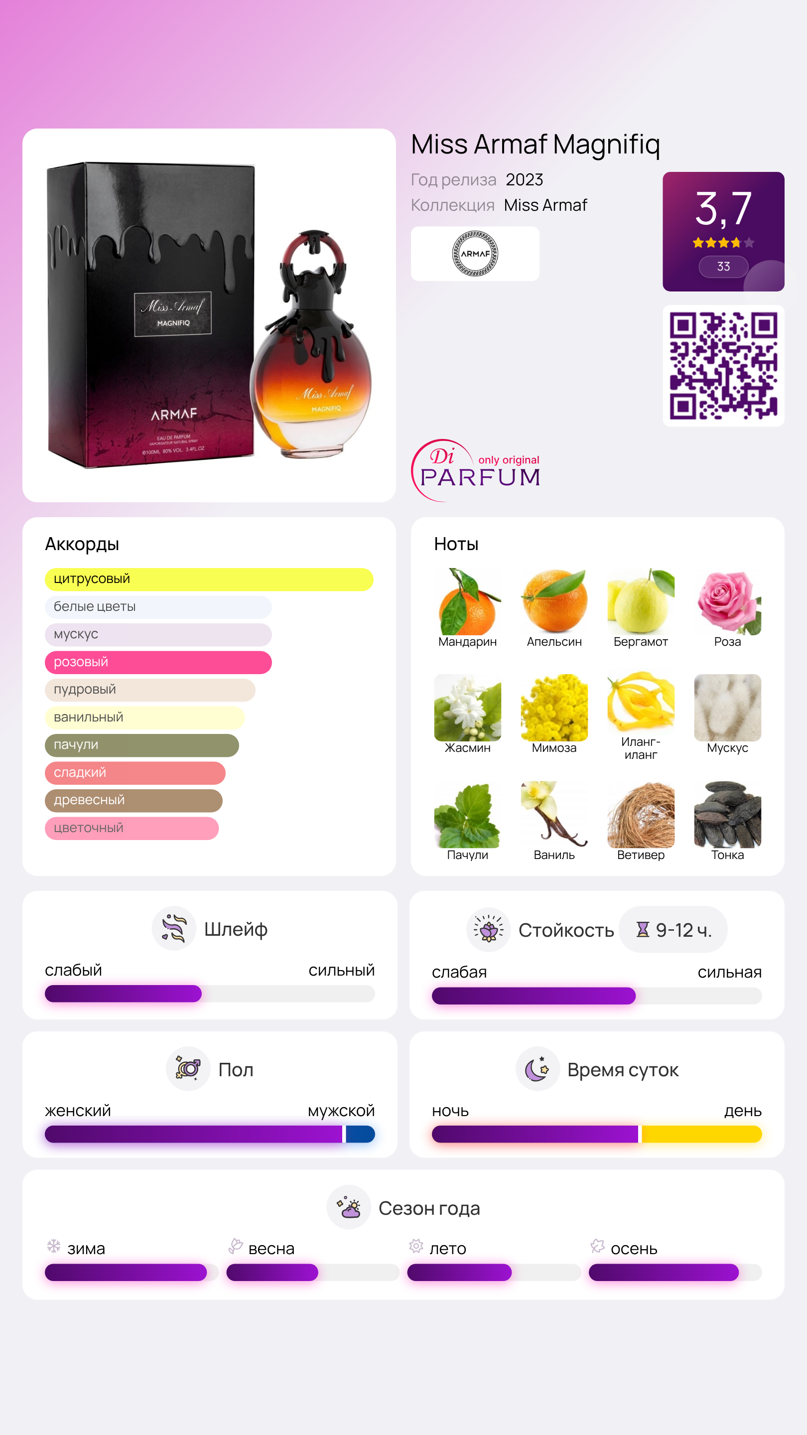 Обволакивающий шлейф завершает композицию чувственным мускусом и дымчатыми нотами ванильных бобов тонка. Аромат раскрылся в духе Coco Mademoiselle. Miss Armaf Magnifiq был представлен в 2024 году как часть коллекции, в которой каждая композиция символизирует «финалистку конкурса красоты». Парфюмеры известного арабского бренда создали разнообразные «Мисс» в различных категориях для этого уникального показа.