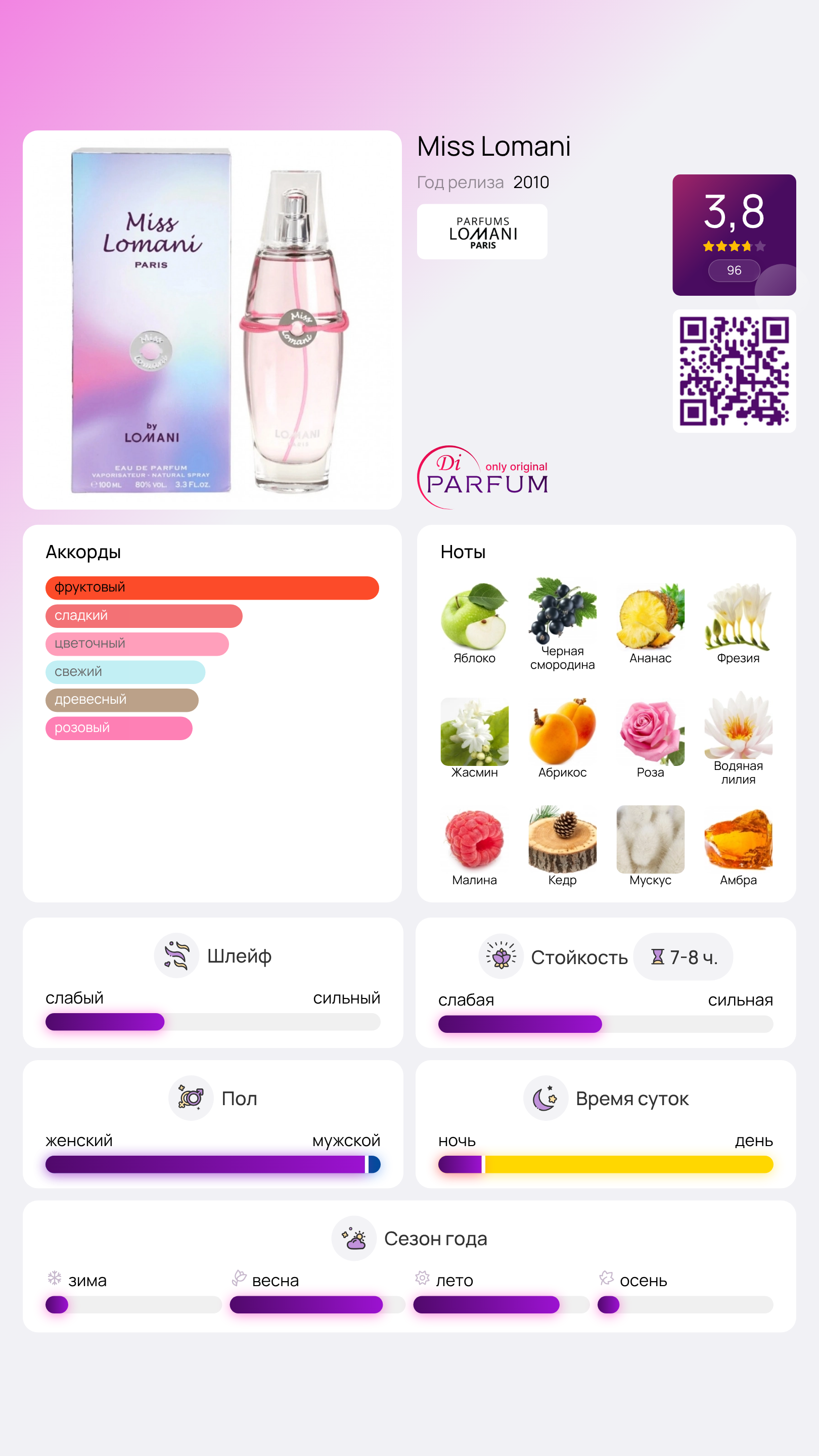 Базовые ноты малины, кедра, мускуса и амбры добавляют аромату глубину и теплую роскошь, придавая ему стойкость и шлейф, который будет сопровождать вас в течение всего дня. Miss Lomani — это идеальный выбор для романтических встреч и утонченных мероприятий, где вы хотите выделиться и оставить незабываемое впечатление.
