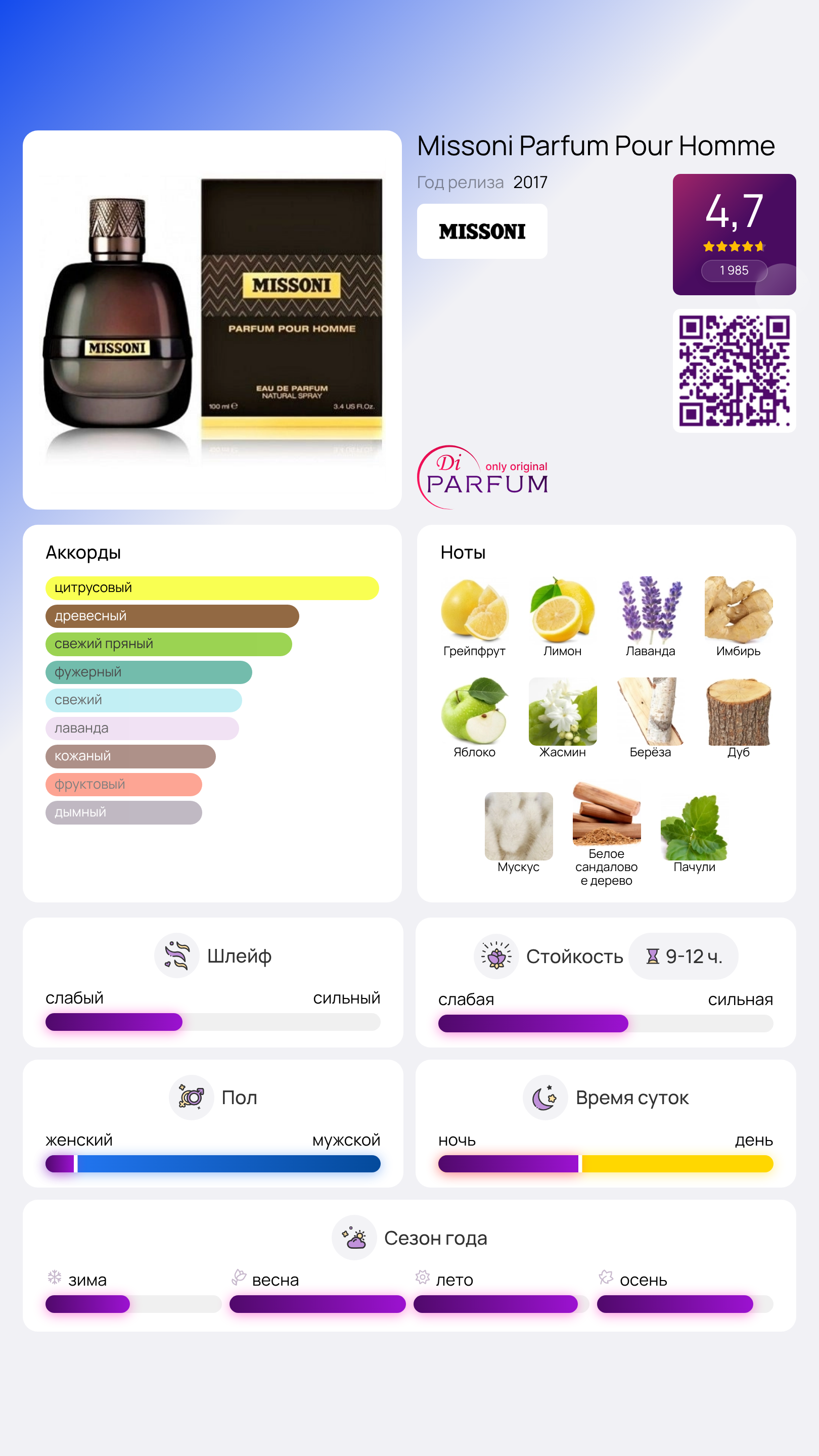 Парфюм Missoni Parfum Pour Homme представляет собой образец древесной фужерной композиции, которая воплощает в себе классические парфюмерные традиции. Несмотря на свою относительную молодость, этот аромат уже обладает характеристиками, свойственными винтажным букетам.
