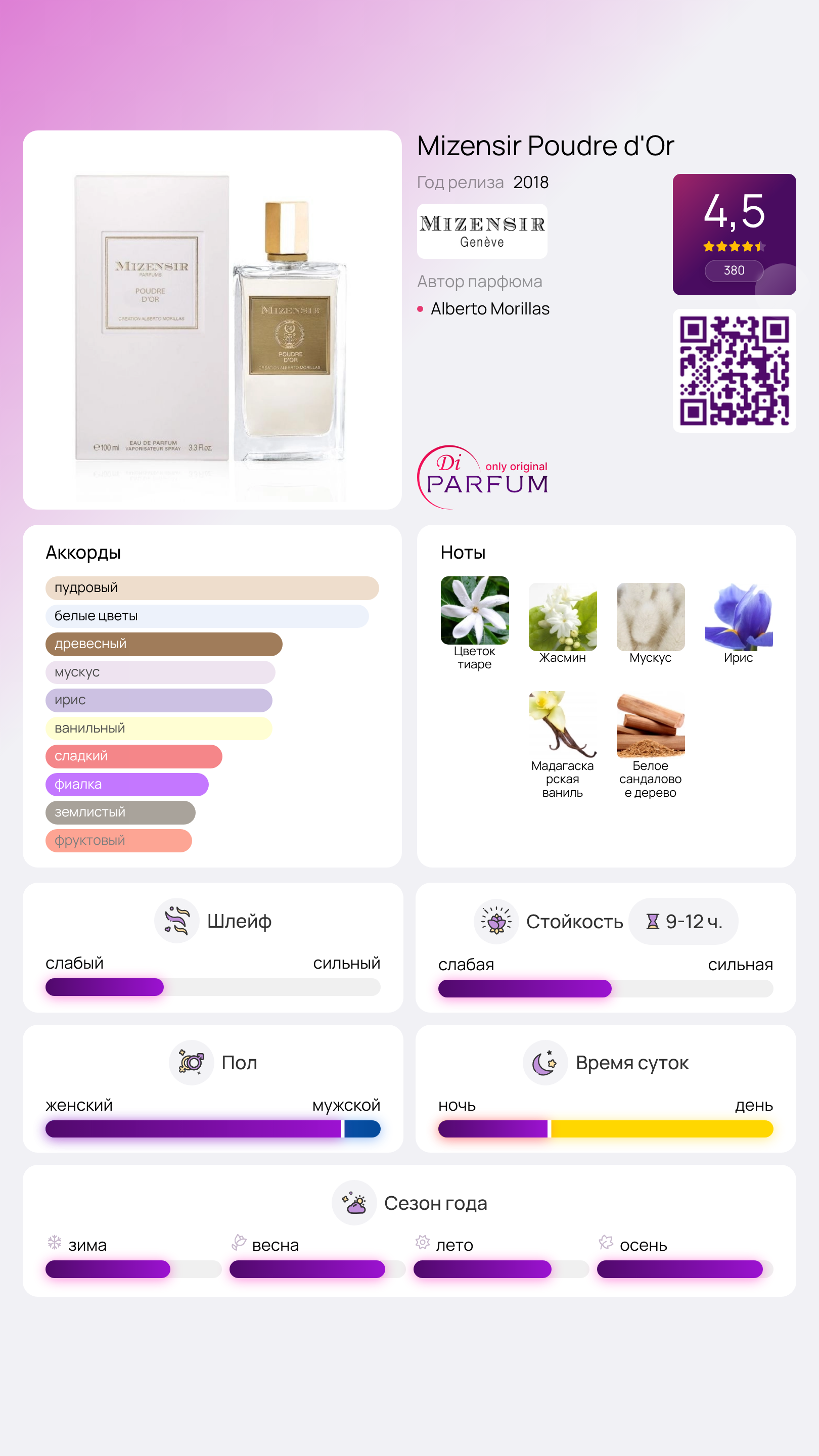 Poudre d'Or от Mizensir — это восточно-цветочный аромат, созданный как для женщин, так и для мужчин. Выпущенный в 2018 году, он стал настоящей находкой для любителей уникальных и изысканных композиций. За созданием этого парфюма стоит знаменитый парфюмер Альберто Морияс, который вложил свою душу и мастерство в каждую ноту.