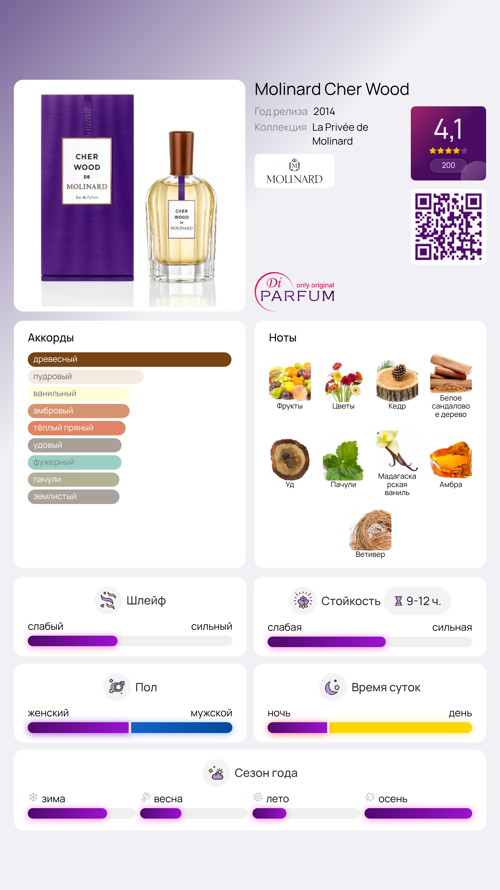 Спускаясь вниз, Molinard Cher Wood обретает текстурные грани ветивера и молочные ноты кедровой смолы, завершаясь объемным амброво-ванильным шлейфом, который вызывает ощущение светлой ностальгии.