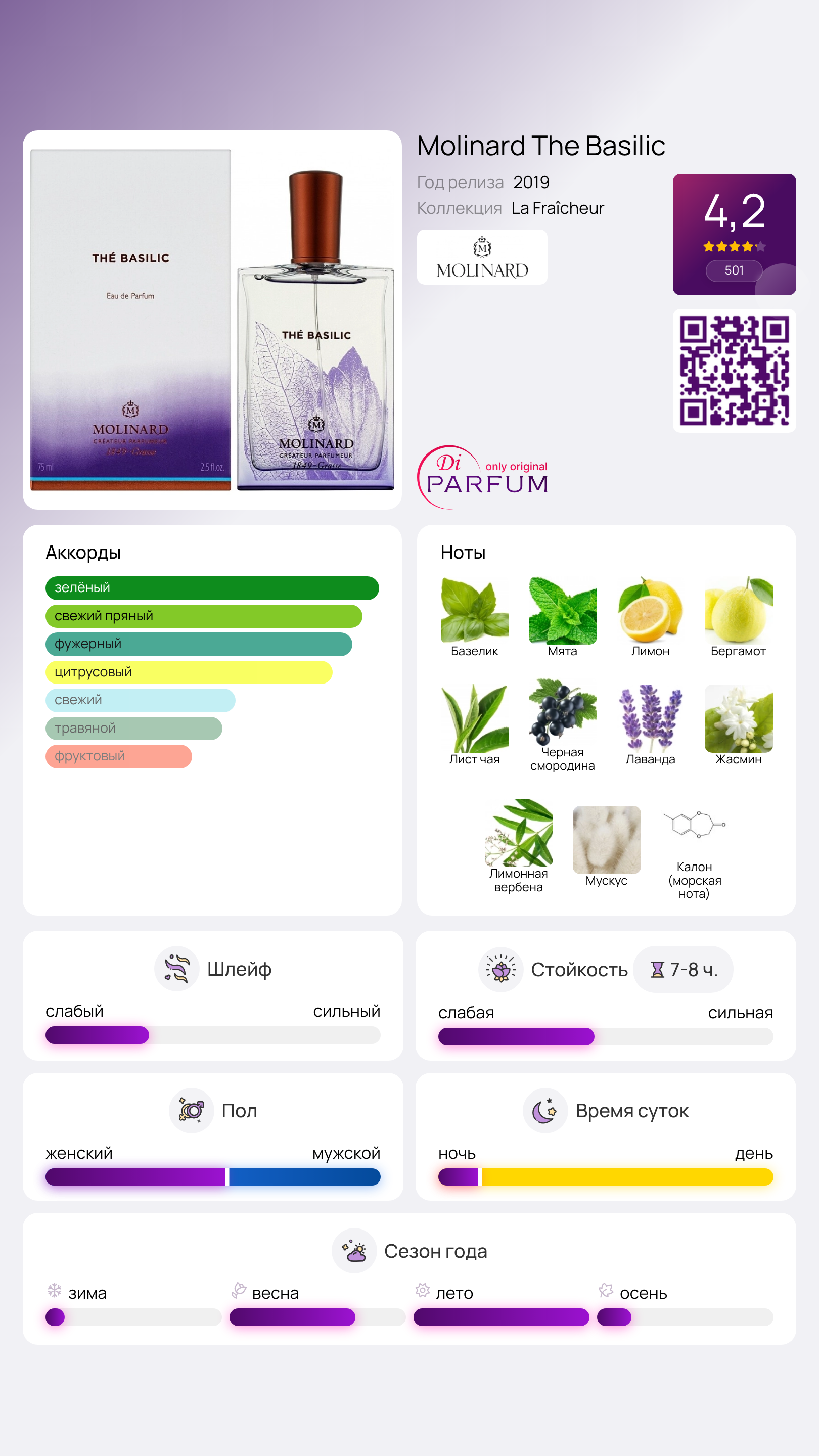 Бодрящий цитрусовый аромат Molinard The Basilic является настоящим посвящением свежему базилику, который растет на благоуханном острове Шри-Ланка. Это идеальный выбор для весенне-летнего сезона. Его природный, освежающий состав создан из только что собранных пряных трав, и наполнен шикарными цветами, которые гармонично дополняют насыщенный зеленый чай. Это парфюмерное творение дарит позитивные эмоции на протяжении всего дня.
