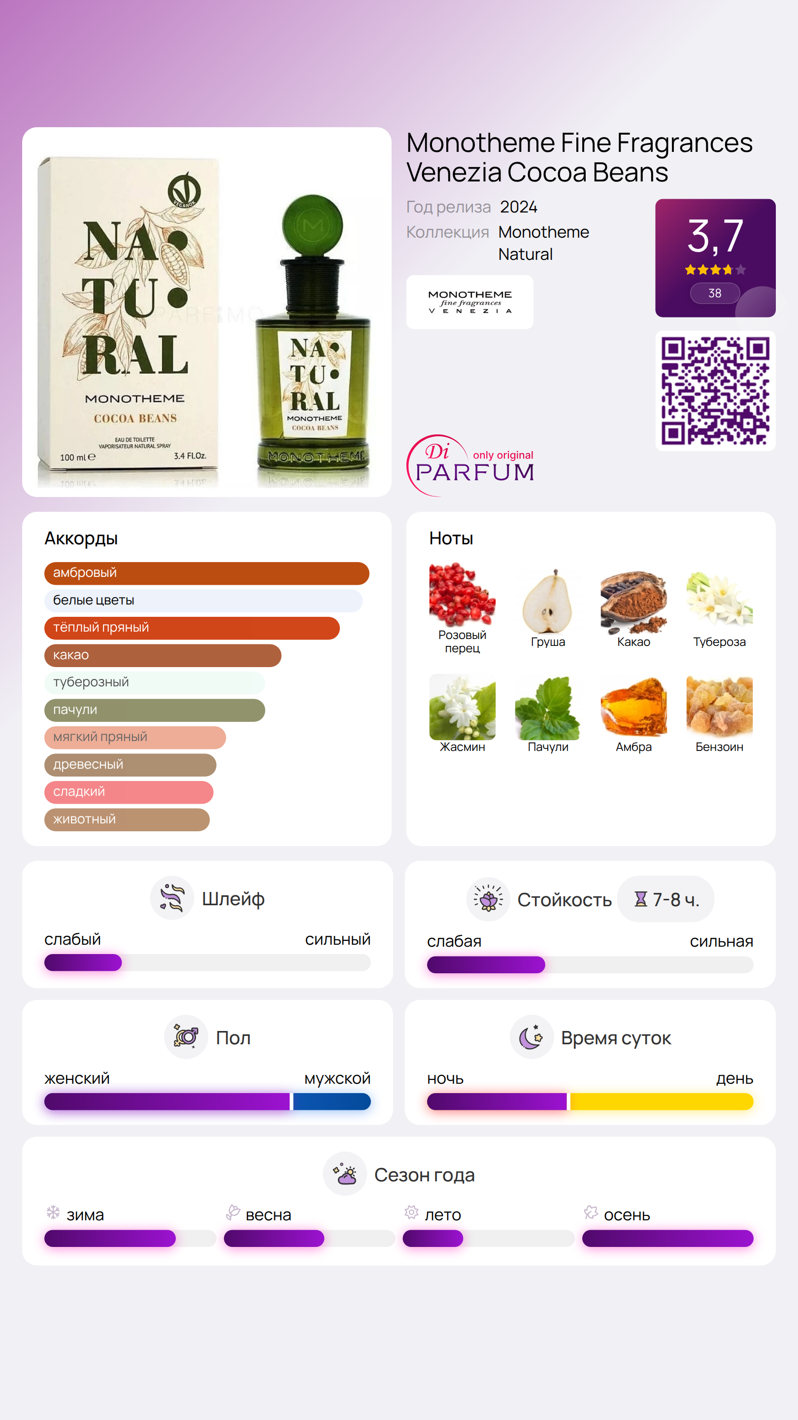 Cocoa Beans от Monotheme Venezia — это универсальный аромат, который подойдет как женщинам, так и мужчинам. Этот новый парфюм был представлен в 2024 году. В его верхних нотах преобладают розовый перец и груша, в сердце разливается сладость какао, жасмина и туберозы, а база аромата состоит из пачули, амбры и бензоина.
