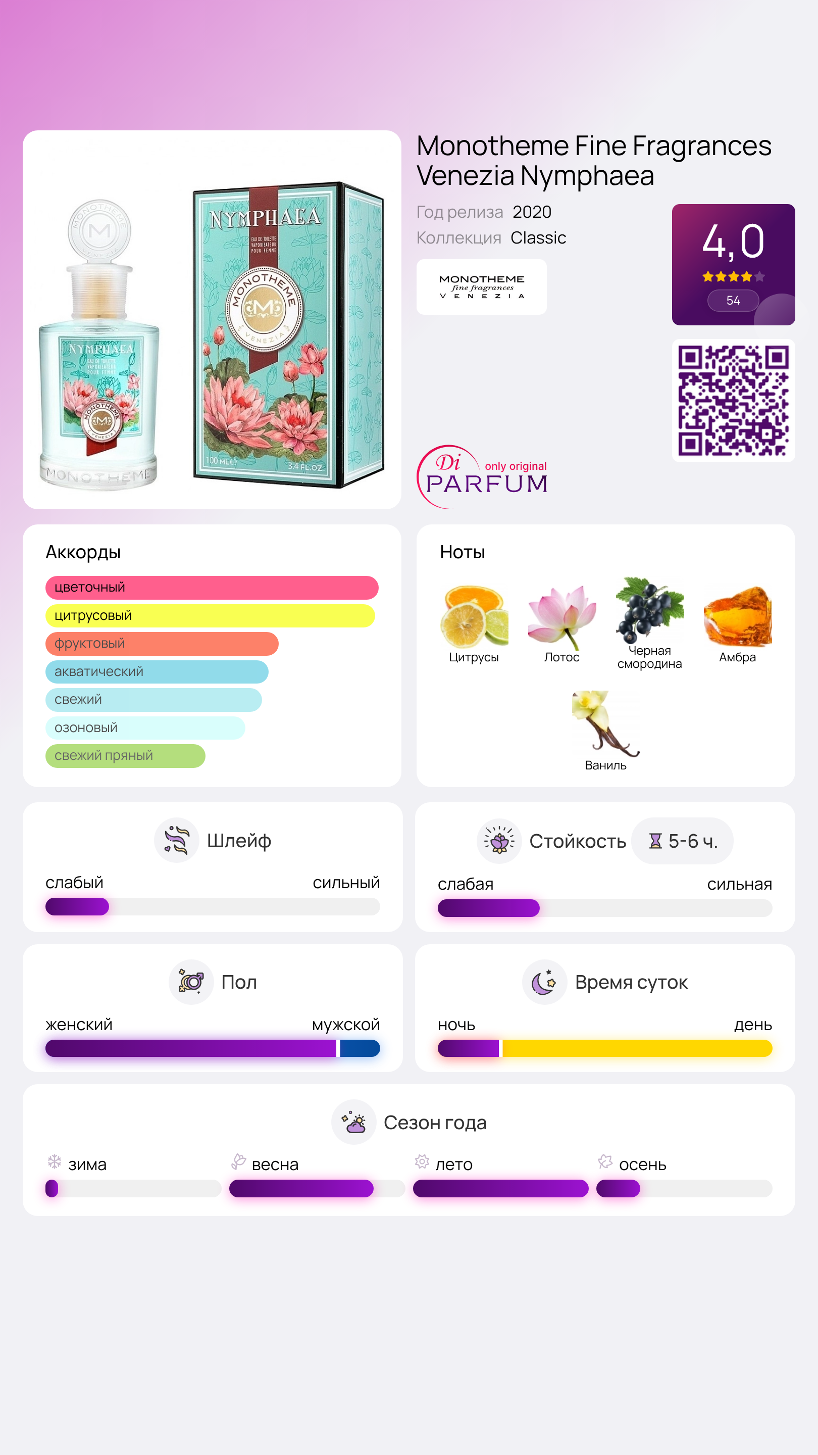 Аромат Monotheme Fine Fragrances Venezia Nymphaea представляет собой современные цветочно-фруктовые ноты, посвященные идее Женственности. Вдохновленный изящным водным лотосом, этот парфюм словно обнимает светом, создавая атмосферу романтики. Он предлагает пользователю погружение в мир лотосов, где воздух напоен сладким цветочным ароматом.