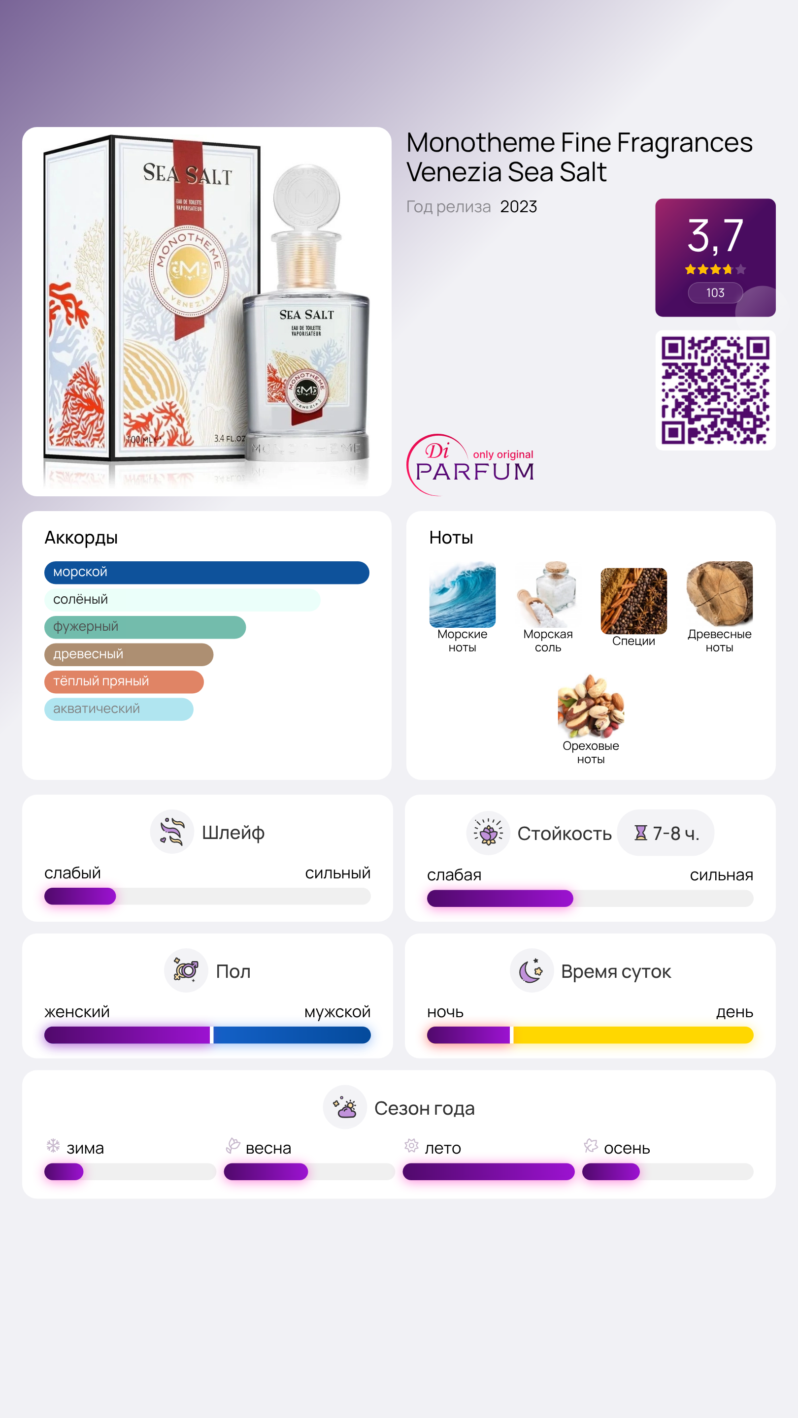 Кроме того, ореховые ноты в составе добавляют нотку уюта и уникальности, что делает Sea Salt подходящим выбором как для повседневной носки, так и для особых случаев. Этот парфюм отлично подойдет тем, кто ценит свежие и необычные ароматы, способные поднимать настроение и вдохновлять на новые свершения.