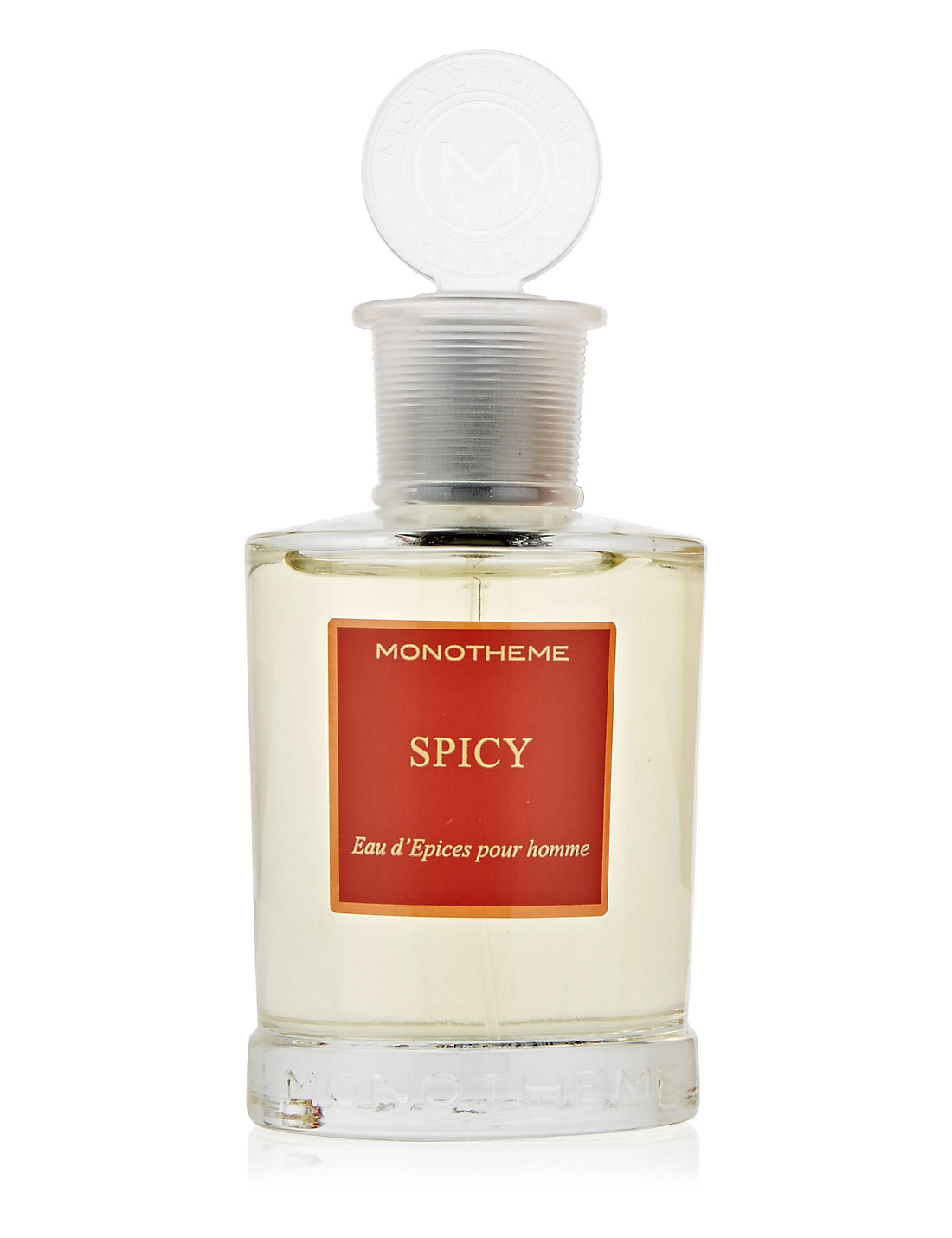 Композиция Spicy от Monotheme Fine Fragrances Venezia создает образ темпераментного и эмоционального мужчины. Этот аромат был представлен итальянским брендом в 2013 году и ориентирован на любителей сухой, простой перечной парфюмерии. Дизайн флакона отражает росыпь восточных пряностей, словно находящихся в древнем деревянном сундуке.