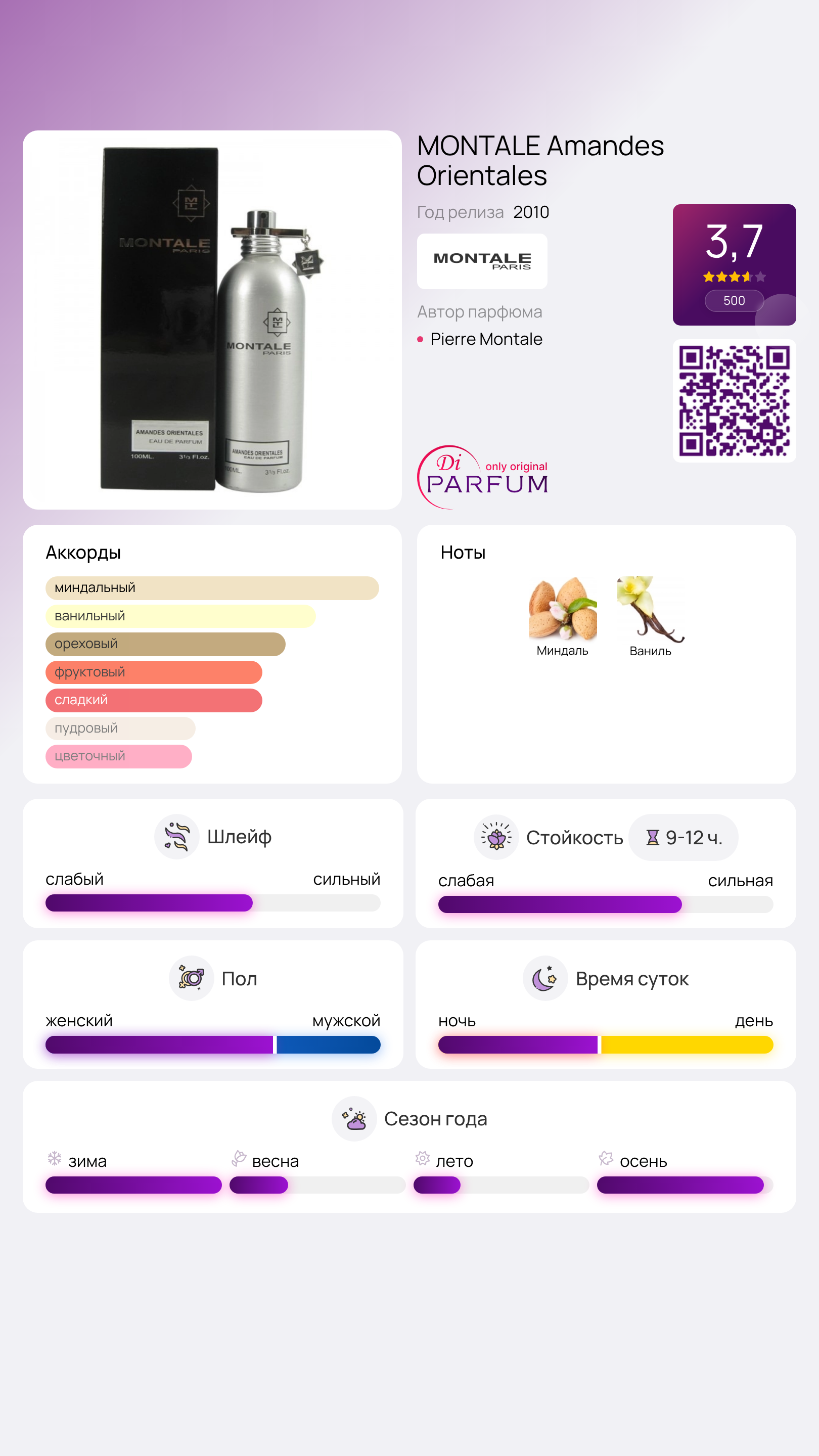 Amandes Orientales принадлежит к гурманской и восточной группе ароматов, что делает его идеальным выбором для тех, кто ценит сладкие и теплые ноты. Главными акцентами этой композиции являются миндаль и ваниль, создающие обворожительный и комфортный шлейф, который не оставит никого равнодушным.