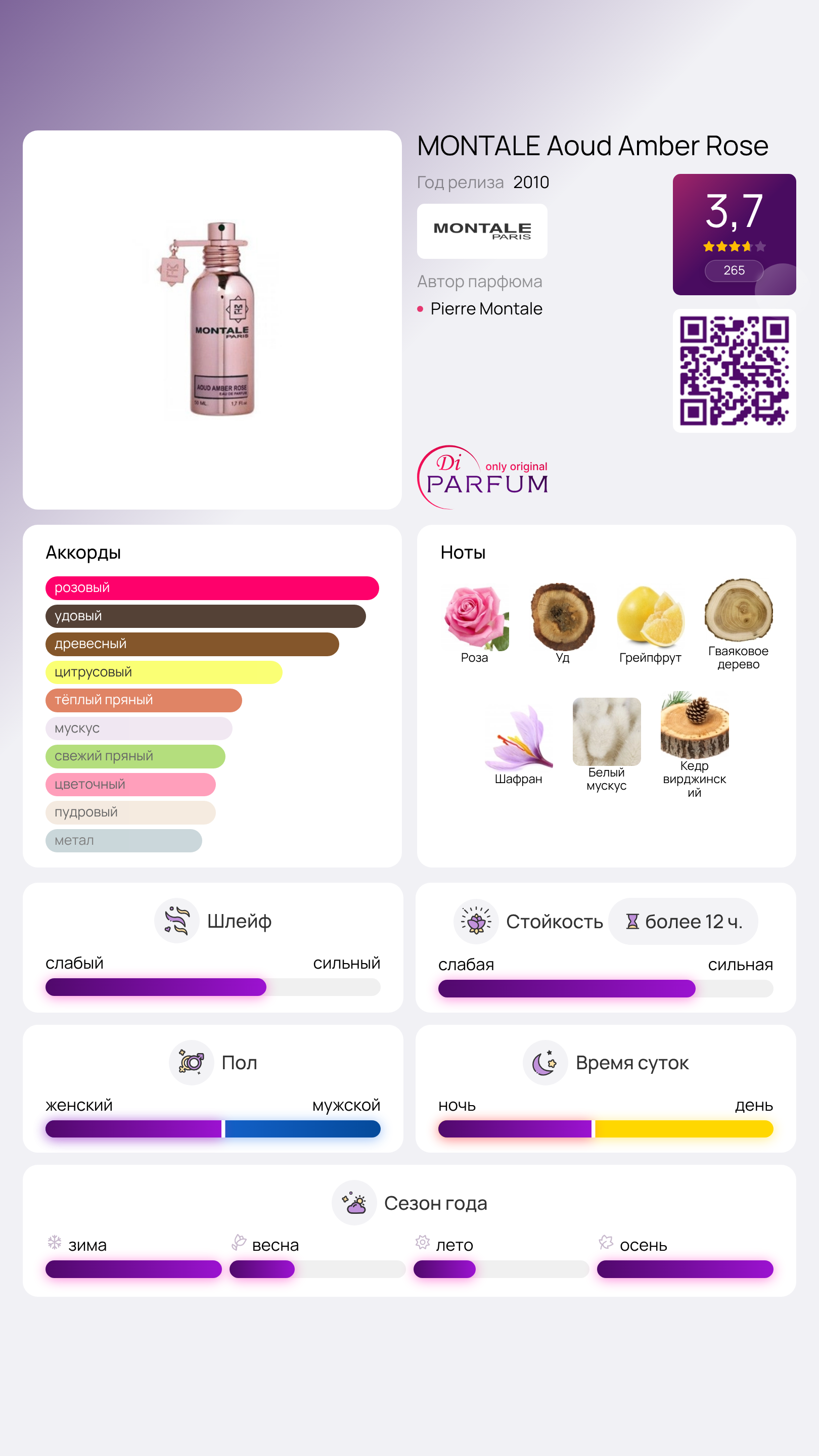 Аромат открывается яркой и свежей нотой грейпфрута, которая плавно переходит в сердце аромата с нотами роскошной розы и пряного шафрана. В базе мы ощущаем глубокие и насыщенные аккорды гваякового дерева и кедра, которые придают аромату стойкость и характер. Завершающий аккорд белого мускуса добавляет мистическую легкость и элегантность.