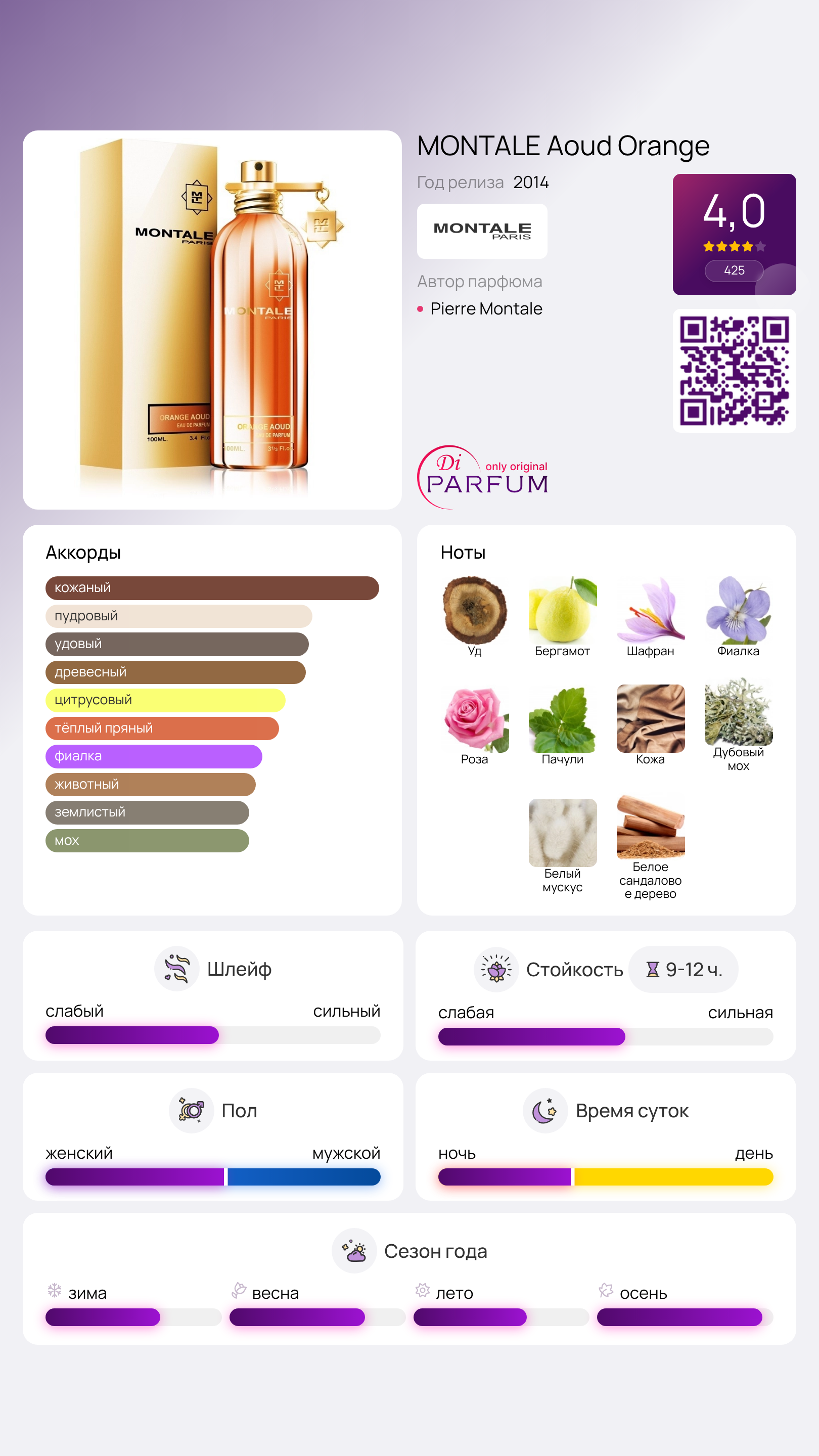 В роскошном сердце аромата сливаются нежные ноты фиалки и розы, придавая ему особую чувственность благодаря нюансам пачули. Завершающий аккорд включает благородные ноты сандала и кожи, дополненные утонченным белым мускусом и дубовым мхом, создавая завершенный и гармоничный образ.
