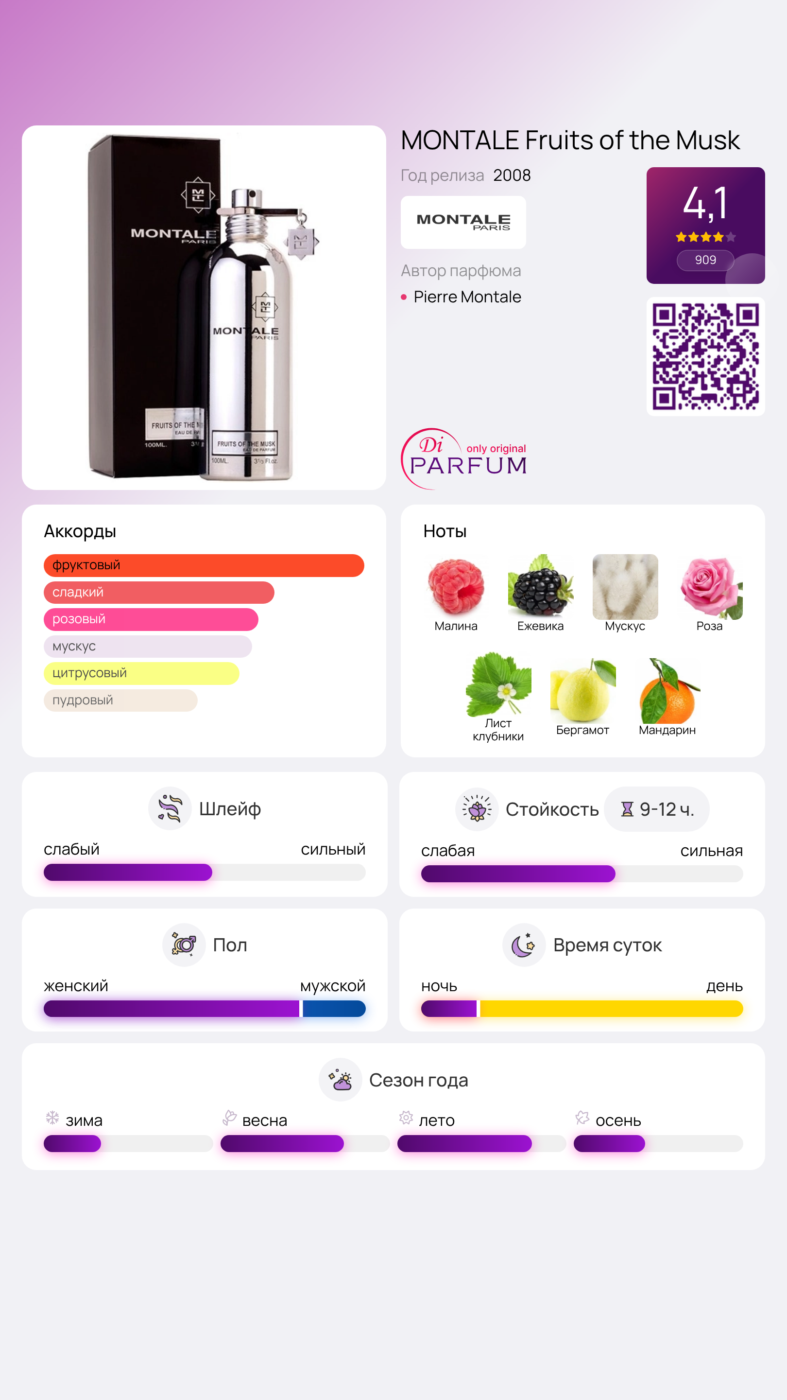 Для летнего отдыха Fruits of the Musk от Montale — идеальный выбор. Он прекрасно звучит в умеренно облачные дни, когда влажный воздух помогает раскрыть весь фруктово-ягодный облик, а в солнечные дни на горячей коже цветочные ноты становятся более выразительными. Хотя мужчины редко выбирают подобные ароматы, для женщин они представляют собой настоящий восторг.