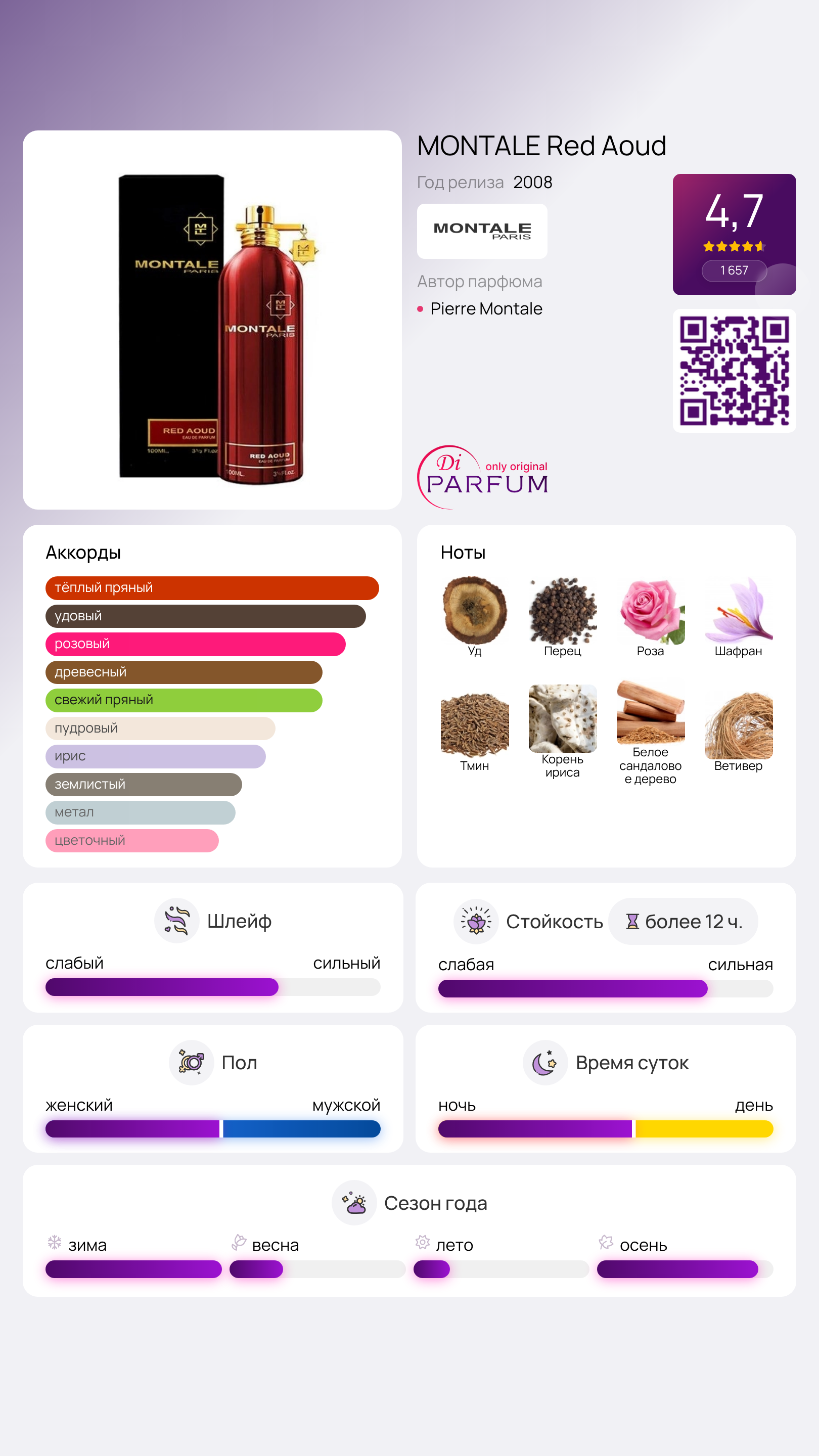 Red Aoud от Montale — это восточно-древесный пряный аромат, созданный как для мужчин, так и для женщин. Запуск парфюма состоялся в 2008 году, а автором данного произведения является талантливый парфюмер Пьер Монталь. Верхние ноты раскрываются богатым акцентом уда и острым перцем, переходя в сердце композиции, где сливаются яркие ноты розы, шафрана и тмина. Завершают аромат базы ноты корня ириса, сандала и ветивера, что придаёт ему глубокую и незабываемую стойкость.