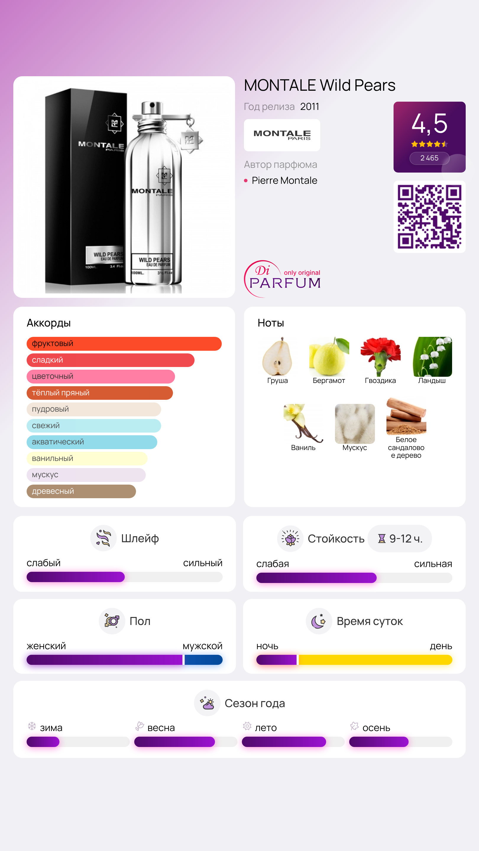 Парфюм Дикая груша Wild Pears от Montale продолжает традицию унисекс, заложенную его предшественниками, экспериментируя с натуральной сладостью. В отличие от похожих фланкеров 2000-х, здесь сохраняется классическая структурированная пирамидальность, позволяющая раскрыть, казалось бы, банальные ноты с новой стороны.