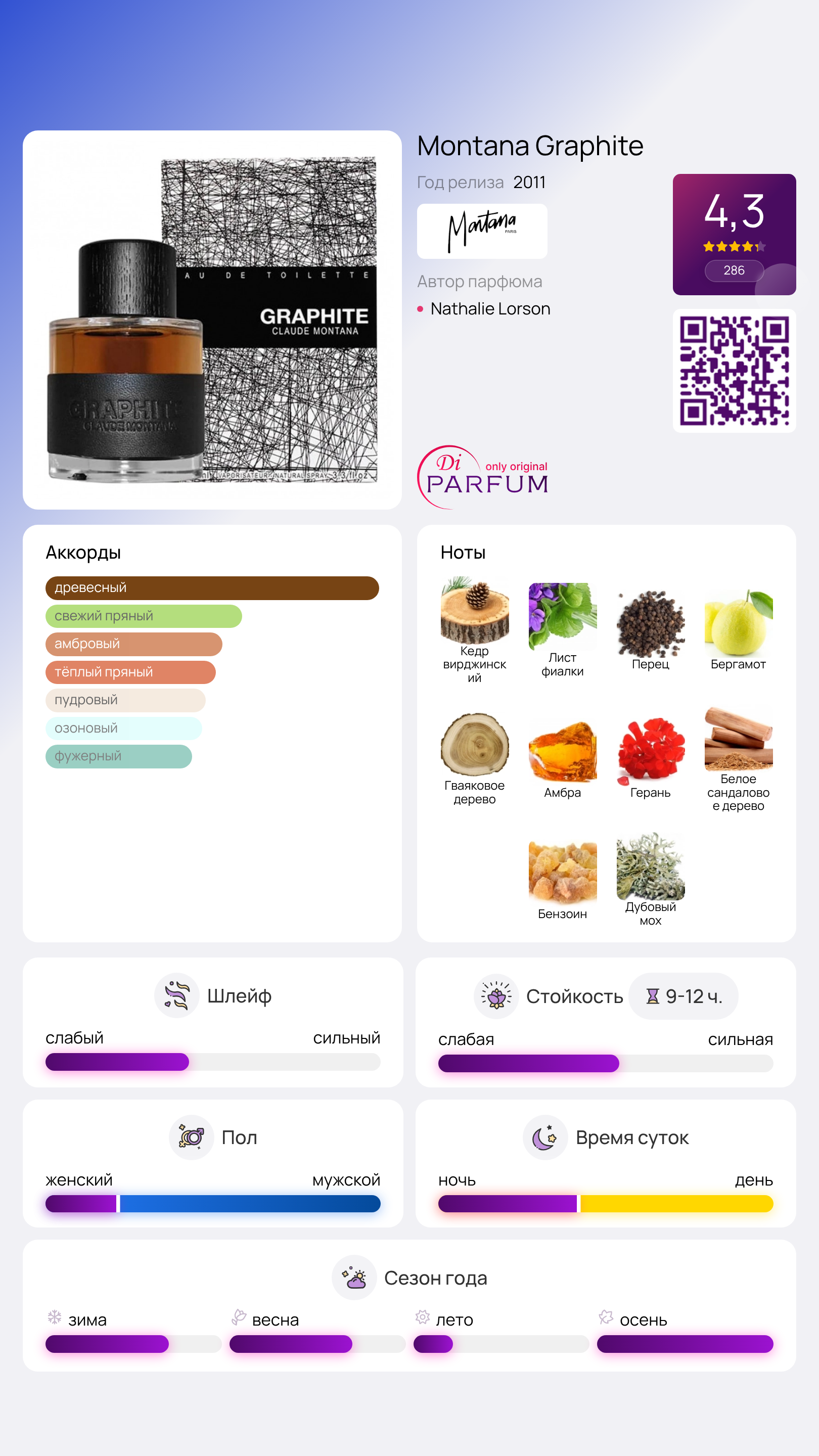 Элегантный и стильный Graphite от Montana подчеркивает все сильные стороны своего обладателя, соединяя мужественность и мягкость, харизму и решительность. Этот аромат, представленный старинным брендом в 2011 году, является идеальным примером мужской утонченности в французском стиле. Дизайн флакона вызывает ассоциации с черной кожей и насыщенным деревом.