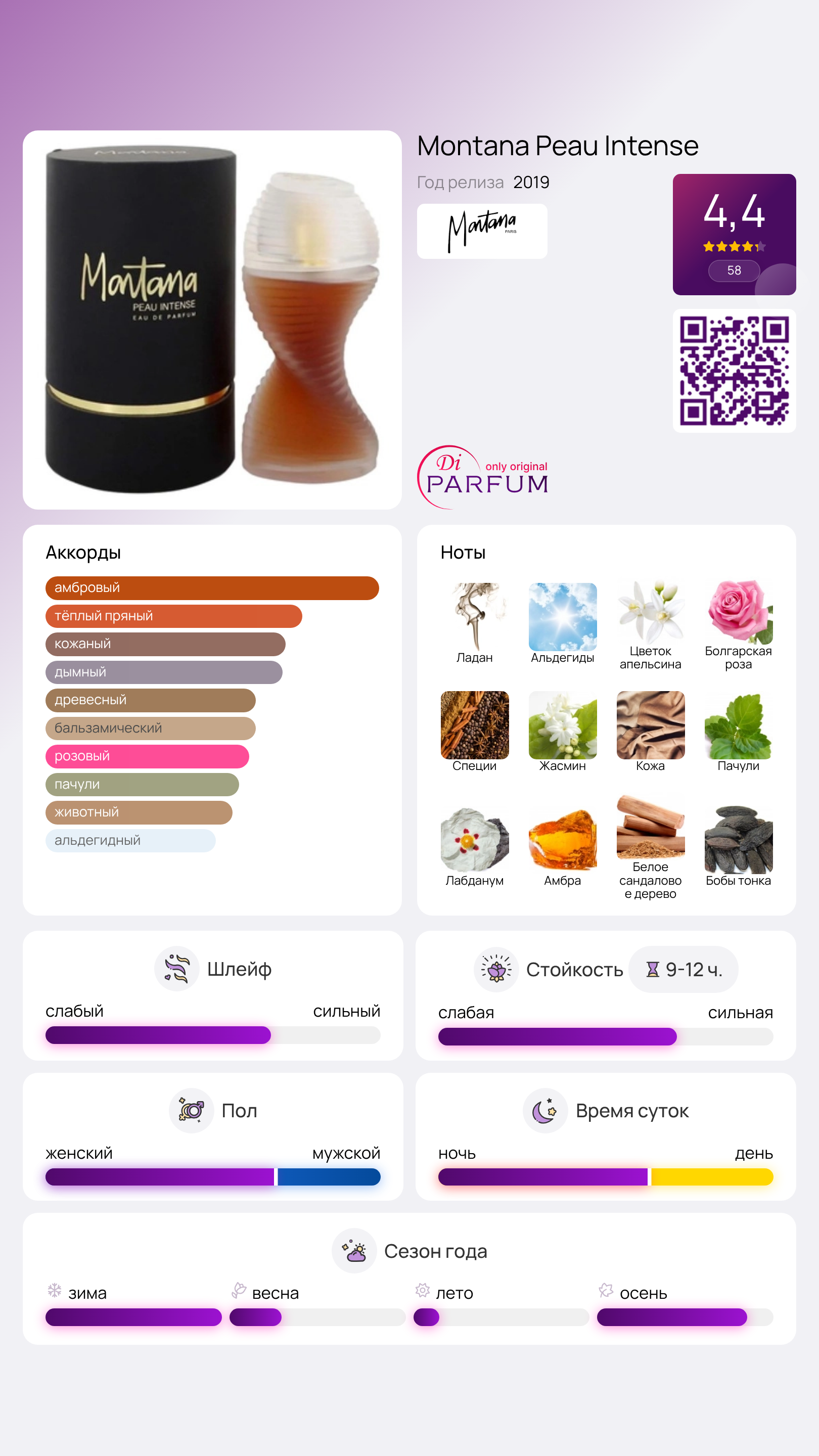 Зеленая горчинка пачулей вызывает мысли о фужере, в то время как хрустящие альдегиды и дымный ладан дополняют образ дорогой кожаной куртки, которые сделали дом моды Montana знаменитым в 80-х, удостоив его титула «короля подплечников». В завершении композиций звучат ванильные бобы тонка и сливочный сандал. Аромат Peau Intense от Montana предназначен для любительниц классики, адаптированной к современным реалиям. Это одни из лучших духов в эпоху ограничений.
