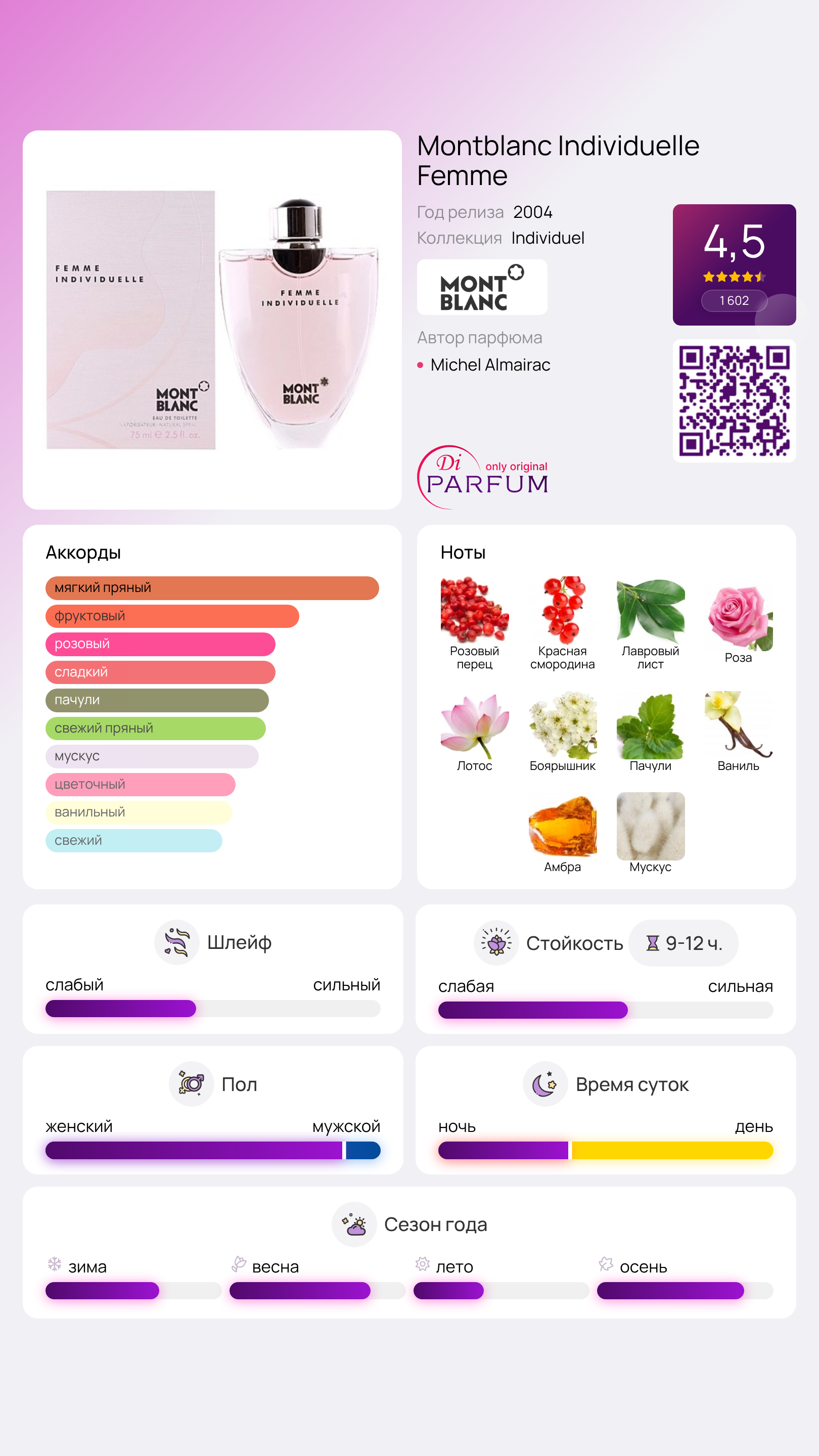 Роскошный и праздничный Mont Blanc Individuel Femme способен подарить своей владелице ощущение утонченности и исключительности. Яркие аккорды турецкой розы, жасмина, корицы и флердоранжа не только поднимают настроение, но и околдовывают.