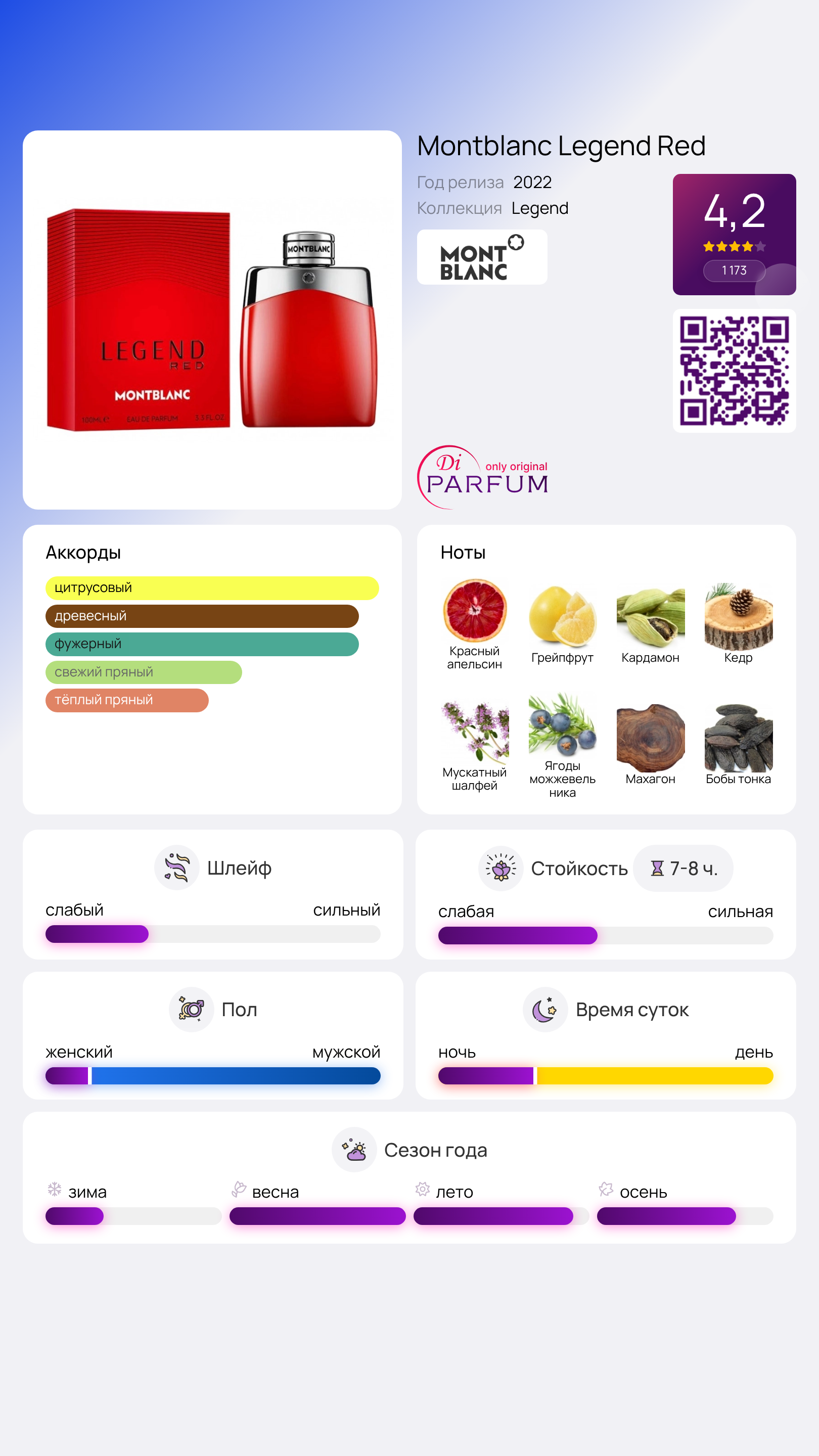В шлейфе раскрывается мужественная композиция, состоящая из смолистого атласского кедра и сладковатых нот табачных бобов тонка. Montblanc Legend Red дарит уверенность и решительность, создавая неповторимые ощущения с момента выпуска фланкера в 2022 году. Этот аромат отлично подойдет как для занятий спортом, так и для рабочего дня или встречи с друзьями, сочетая в себе ноты одеколона и геля для душа.