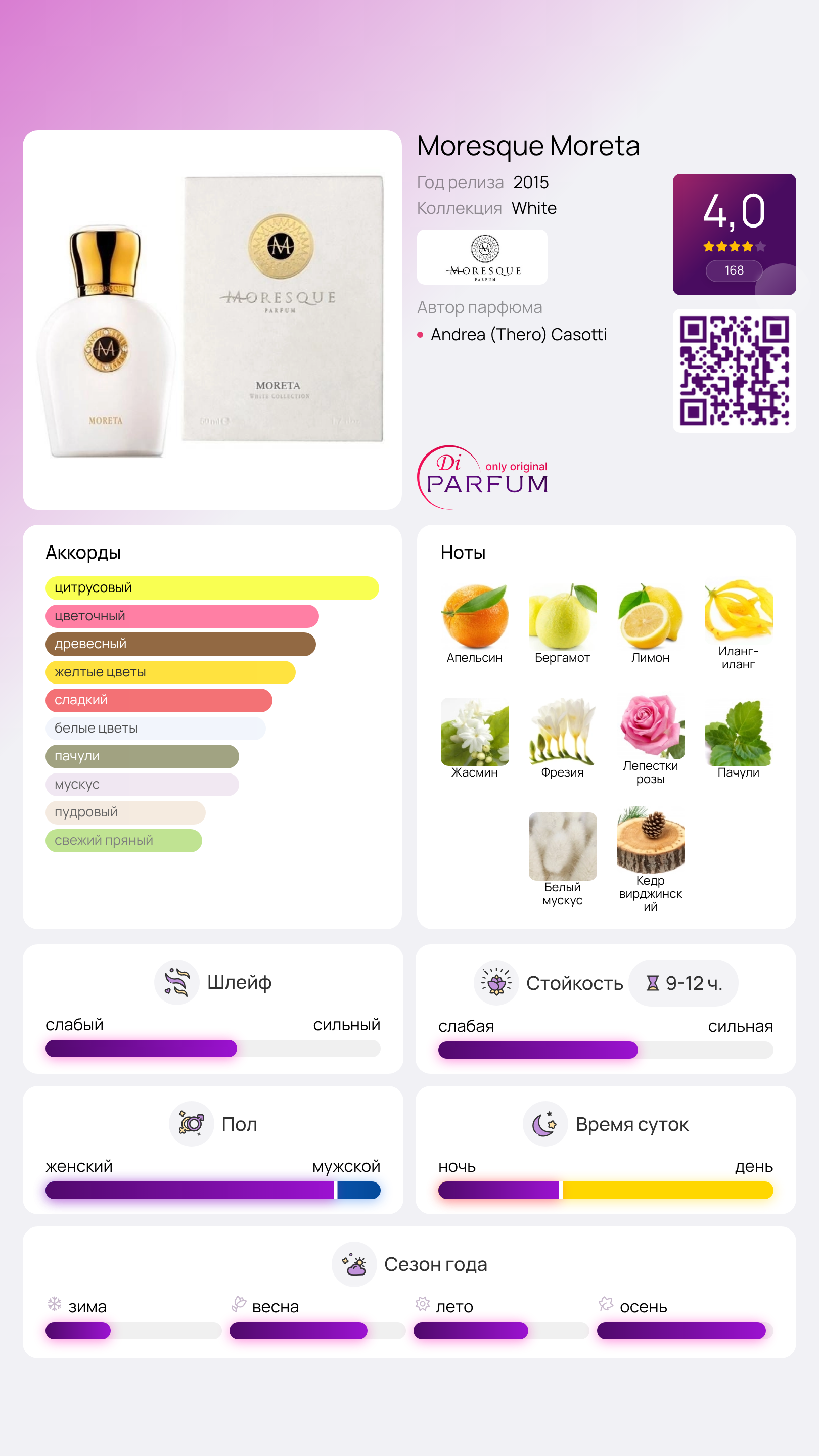 Аромат Moreta, созданный парфюмером Andrea Thero, вдохновлен невероятно привлекательной женщиной, но при этом он позиционируется как унисекс. Эту парфюмированную композицию отличает устойчивость и насыщенный сливочный оттенок, а главная нота иланг-иланга делает тематику парфюма универсальной, придавая владельцу яркий и незабываемый образ.