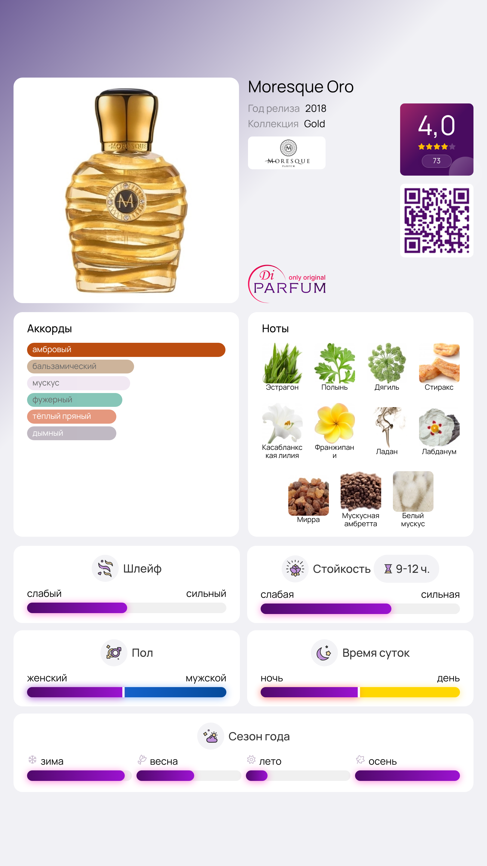 Любители изысканных ароматов, впервые соприкасающиеся с парфюмерией Moresque, часто ошибочно принимают бренд за арабский. На самом деле, восточный стиль в их парфюмах является лишь частью концепции этой молодой марки, которая гармонично сочетает европейский шик и традиции Востока, как это видно на примере композиции Oro.