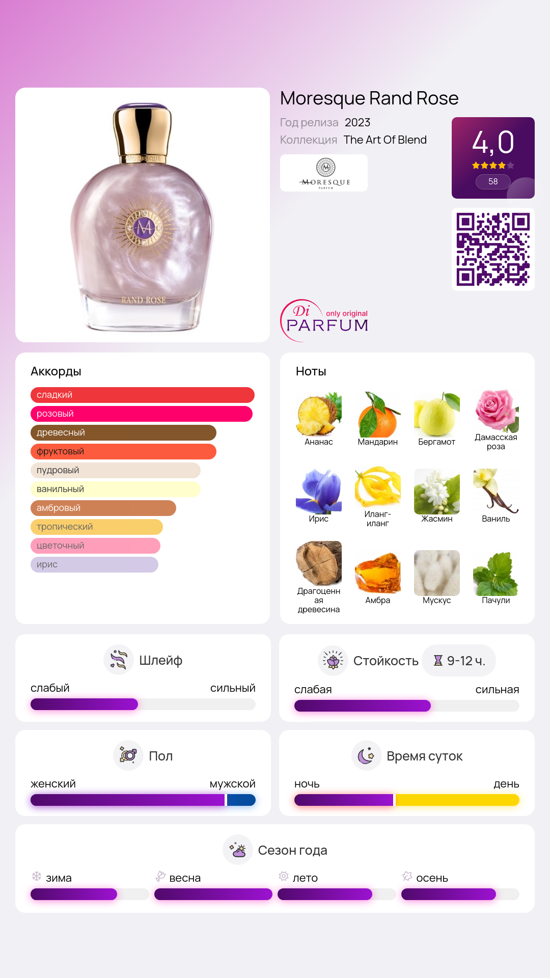 Шлейф аромата обволакивает смолистыми оттенками амбры и драгоценной древесины, а чувственный мускус и таинственный уда наполняются сладковатой обволакивающей ванилью. Rand Rose – многослойная композиция от Moresque, ставшая частью трилогии в рамках коллекции The Art of Bend. Флакон нежно-розового цвета сияет перламутром и напоминает изящную амфору, украшенную золотым логотипом с мерцающими кристаллами.