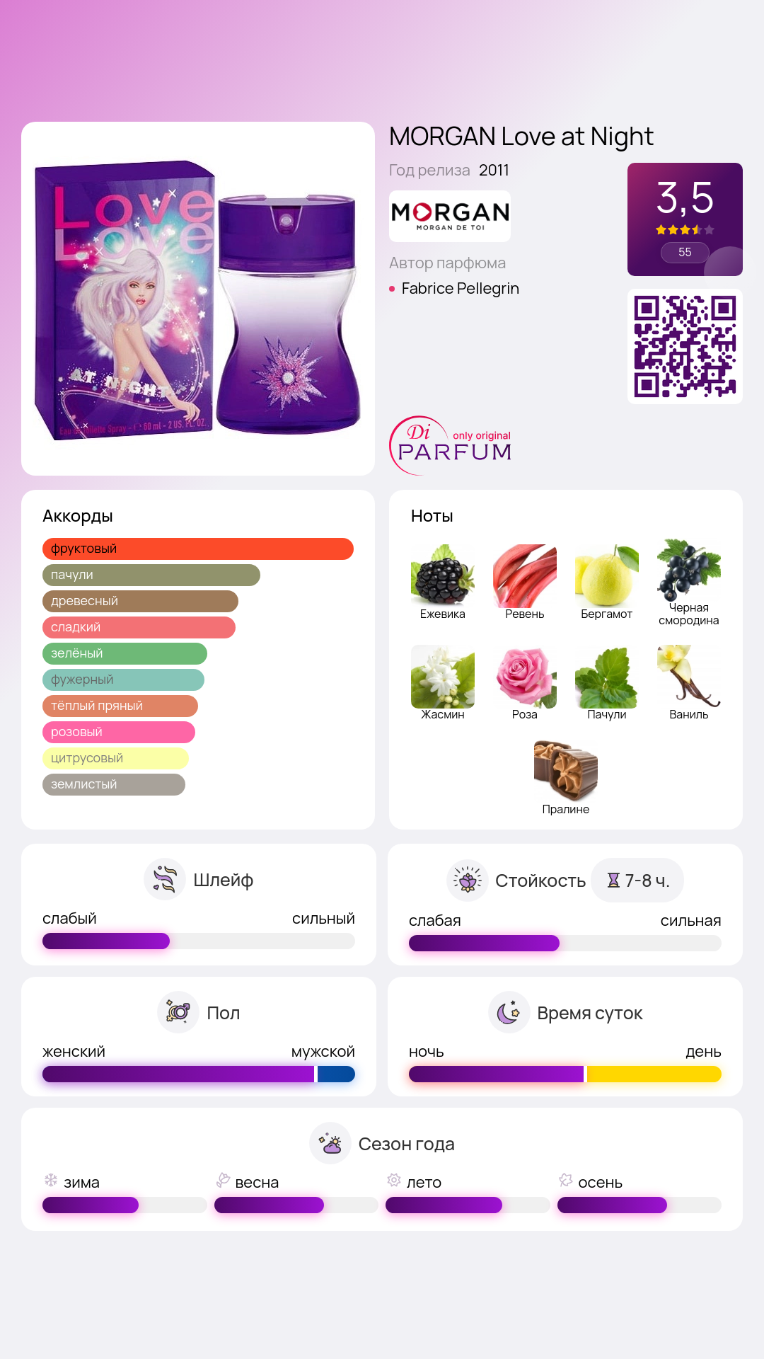 Аромат под названием Love at Night говорит о себе сам. Он сладок и сочен, соблазняя своей юной непосредственностью, которая плавно перерастает в бурную женскую страсть. Это состояние всегда напряжено и на грани, таким и является чувство любви в ночное время!