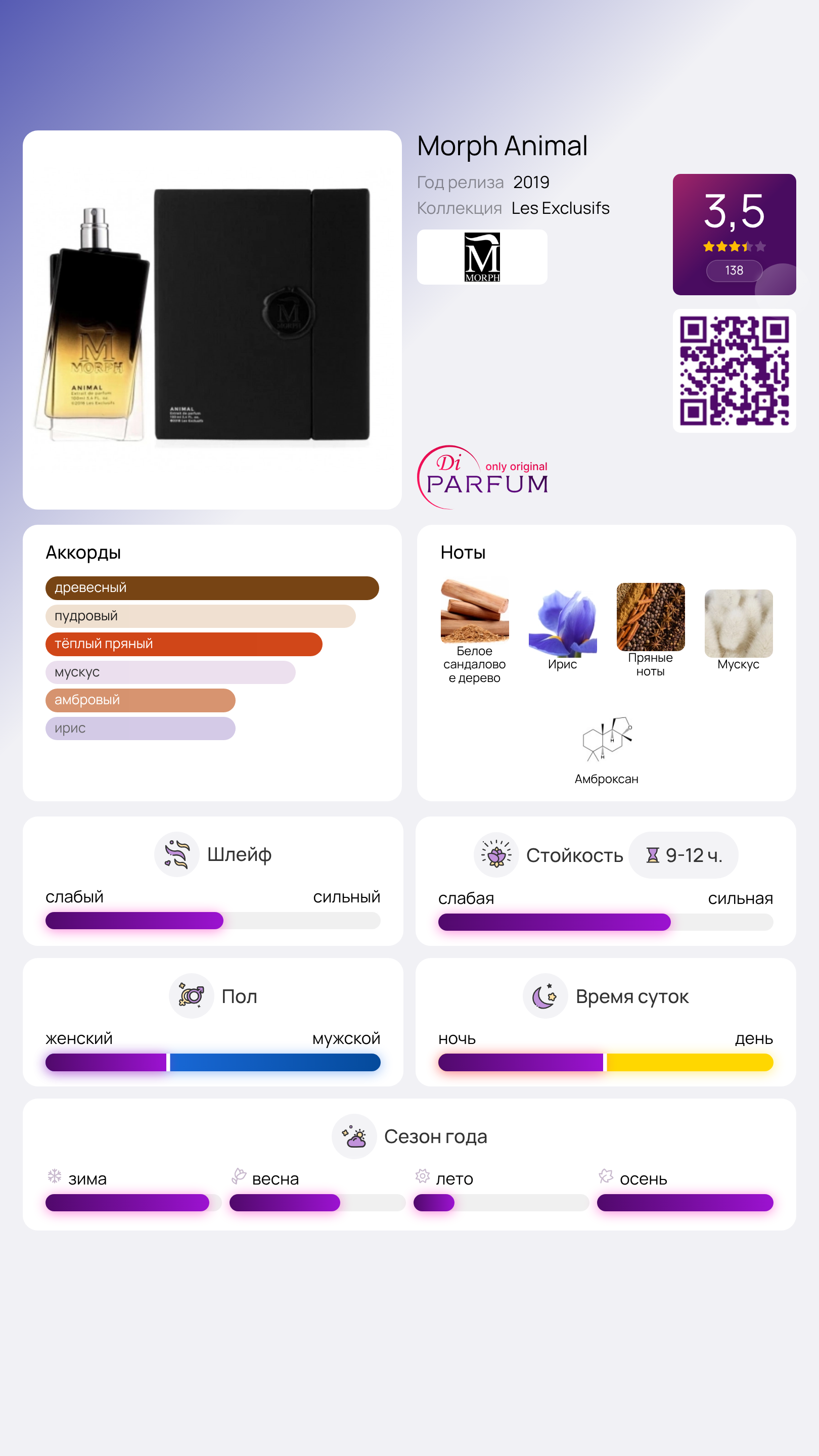 Пряный и древесный аромат унисекс Morph Animal от итальянского нишевого парфюмерного бренда производит впечатление с первых мгновений. Его запоминающаяся черная упаковка с печатью и оригинальный «двойной» флакон с градиентом черного и янтарного цветов привлекают внимание и подогревают интерес к тому, что скрыто внутри.