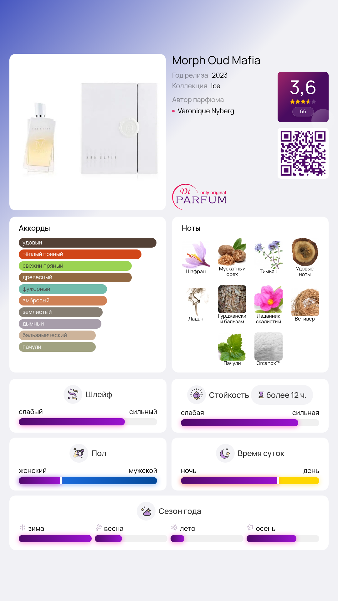 Oud Mafia от Morph – это унисекс аромат, который появился на рынке в 2023 году. Создатель этого изысканного парфюма – талантливый парфюмер Véronique Nyberg. В верхних нотах раскрываются яркие акценты шафрана, мускатного ореха и чабреца, которые подготавливают почву для сердца композиции, где гармонично переплетаются уд, ладан, гурьюнский бальзам и ладанник критский. Завершающие аккорды аромата формируют ветивер, пачули и уникальный ингредиент Orcanox™, создавая насыщенное и шлейфовое послевкусие.