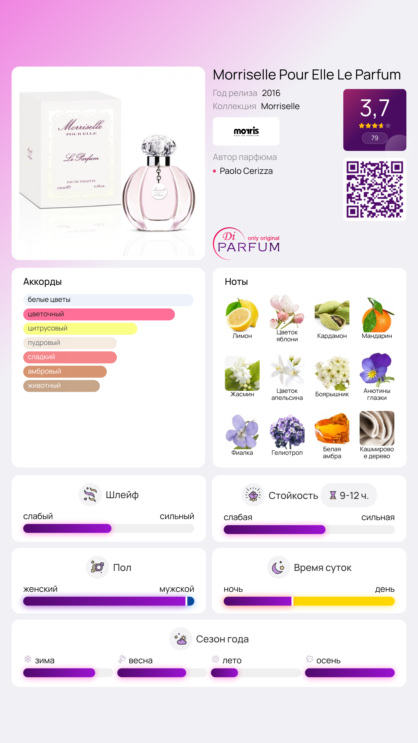 Композиция Morriselle Pour Elle Le Parfum представляет собой новую интерпретацию аромата Morriselle Pour Elle, более женственной и очаровательной. Нежный, теплый и окутывающий флер Morriselle Pour Elle Le Parfum является результатом тщательной работы парфюмеров, которые в начальных нотах сочетали яблоневый цвет, кардамон, лимон и мандарин. В сердце восточно-цветочной пирамиды раскрываются жасмин, апельсиновый цвет, фиалка и анютины глазки, но самым ярким акцентом становится насыщенный боярышник. В качестве базы использованы кашмирское дерево, гелиотроп и белая амбра.