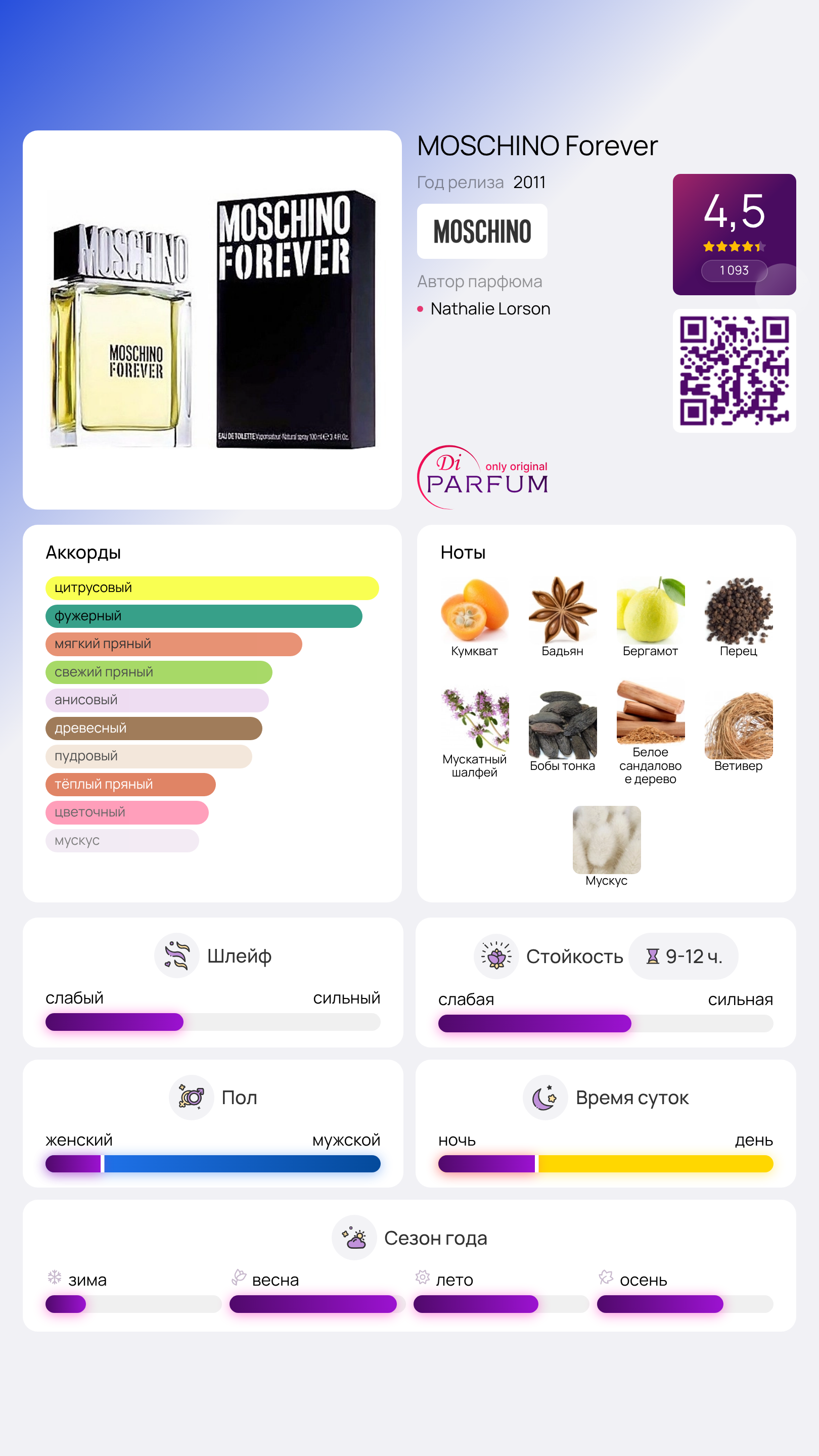 Forever от Moschino представляет собой фужерный аромат, разработанный парфюмером Натали Лорсон, которая также стояла за созданием многих популярных парфюмов для таких брендов, как Lacoste, Lalique и Bvlgari.