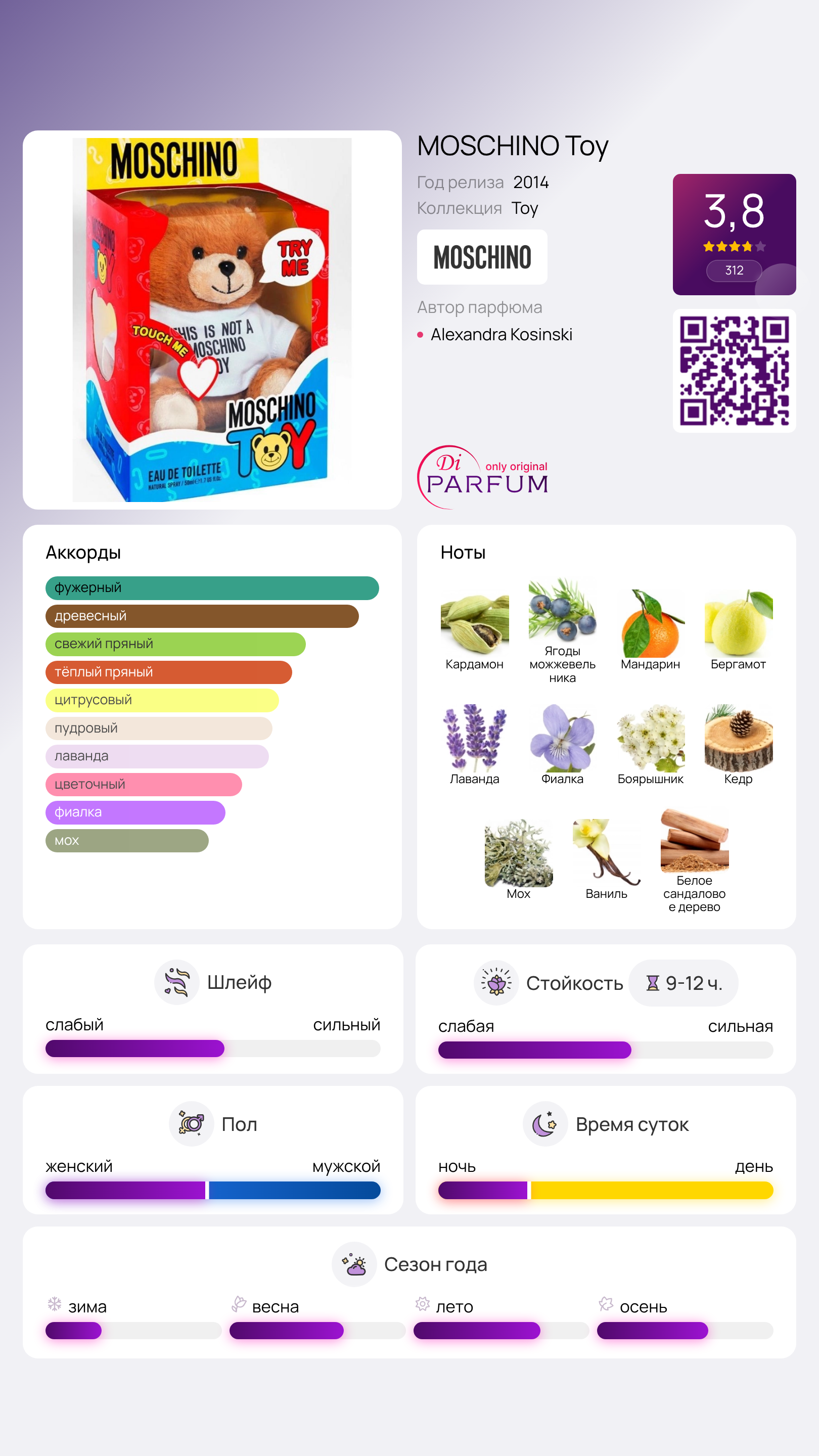 Аромат наполняет пространство игривостью, смешивая терпкий можжевельник и свежий бергамот. В то же время мягкие нотки лаванды, сочетаясь с тонкими акцентами листа фиалки, создают атмосферу уязвимости и открытости. В завершение, богатые древесные ноты придают композиции необходимую глубину и стойкость.