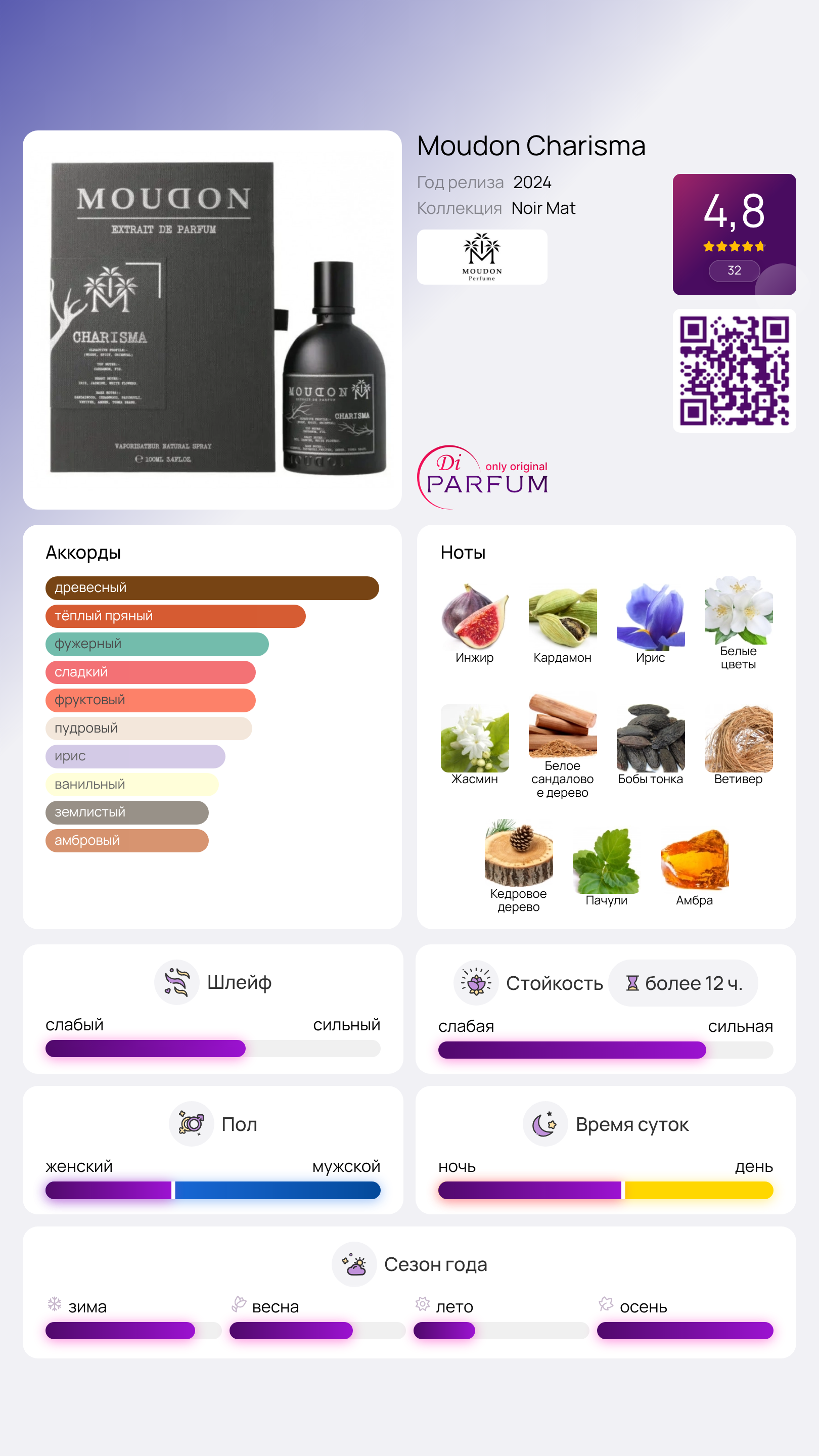 Для почитателей сложных и утонченных ароматов французский парфюмерный дом Moudon выпустил унисекс композицию Charisma, которая вошла в изысканную Noir Mat Collection. Каждый флакон этой линии уникален и запоминается на долго, благодаря своему чувственному и обволакивающему характеру, заключенному в стильный черный матовый контейнер.