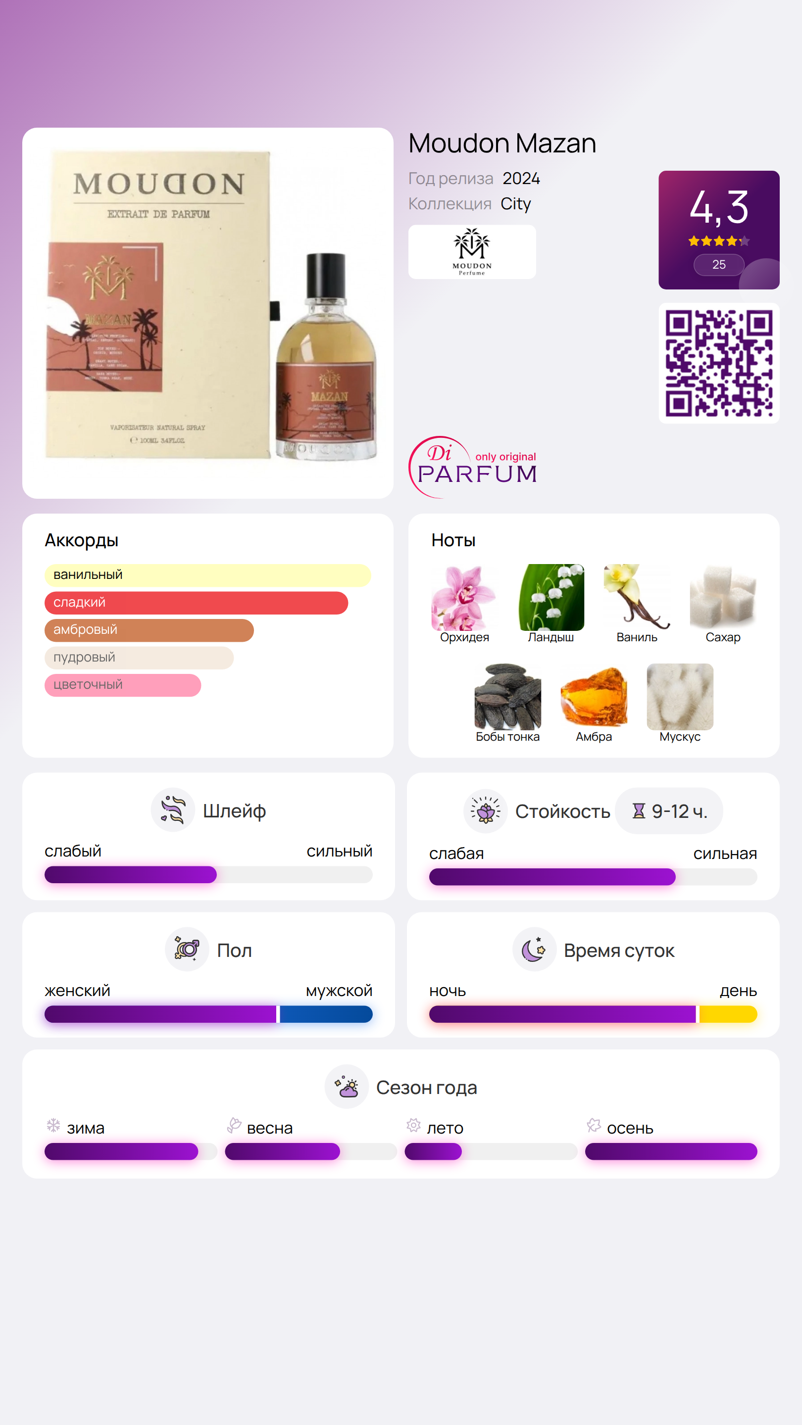 Aромат Moudon Mazan, представляющий собой сладкий восточный унисекс, определенно привлечет к вам внимание. Его гурманские ноты переносят в беззаботные дни детства, когда наслаждение сладостями было главной заботой. Молодой парфюмерный дом Moudon уже завоевал известность как уникальный нишевый бренд, уделяющий особое внимание качеству использованных ингредиентов и создаваемых ароматов.
