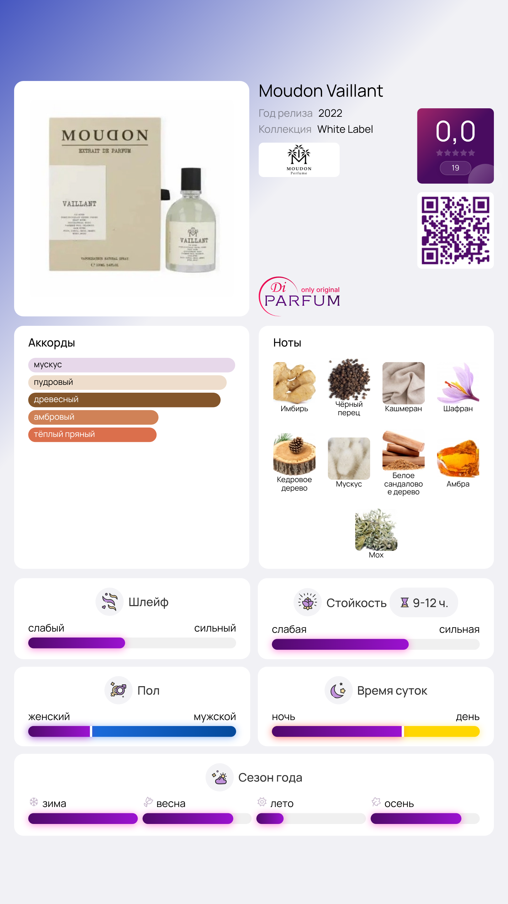 Эти духи подчеркивают привлекательность как мужского, так и женского образа. Элегантный аромат Vaillant от Moudon, выпущенный в 2022 году арабским брендом, представляет собой свежий взгляд на традиционную восточную парфюмерию. Парфюмеры искусно сочетает натуральные эссенции с эксцентричными молекулами. Лаконичный флакон выполнен в минималистическом дизайне.
