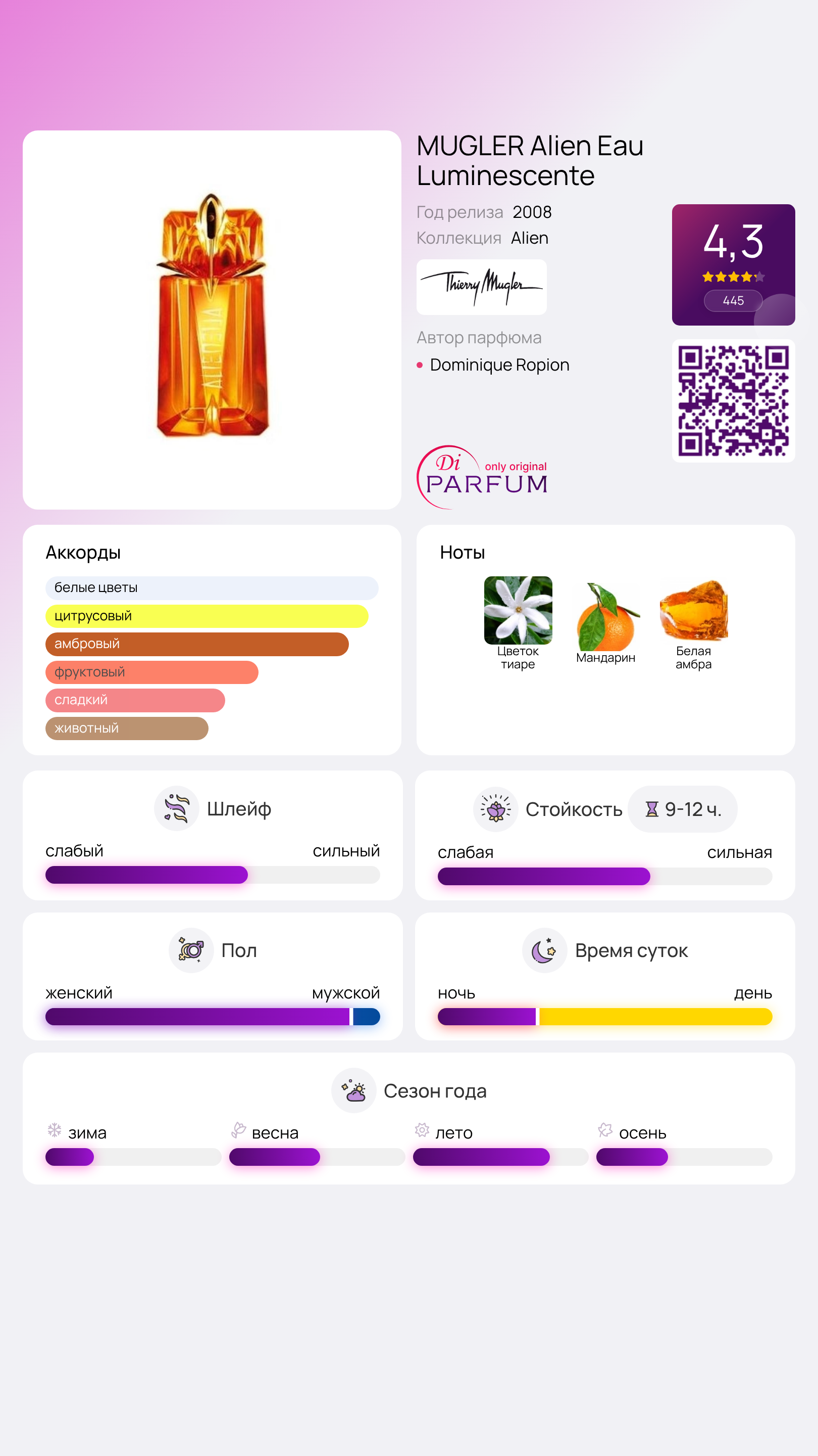 Свежий и игривый, он окутывает цитрусовыми нотами, создавая ощущение свежести и тепла. Экзотичный цветок тиары придаёт аромату уникальную изюминку, а драгоценная белая амбра наполняет его чувственностью и озаряет всё вокруг солнечным сиянием. С этого момента лето и солнечный свет будут всегда рядом с вами!