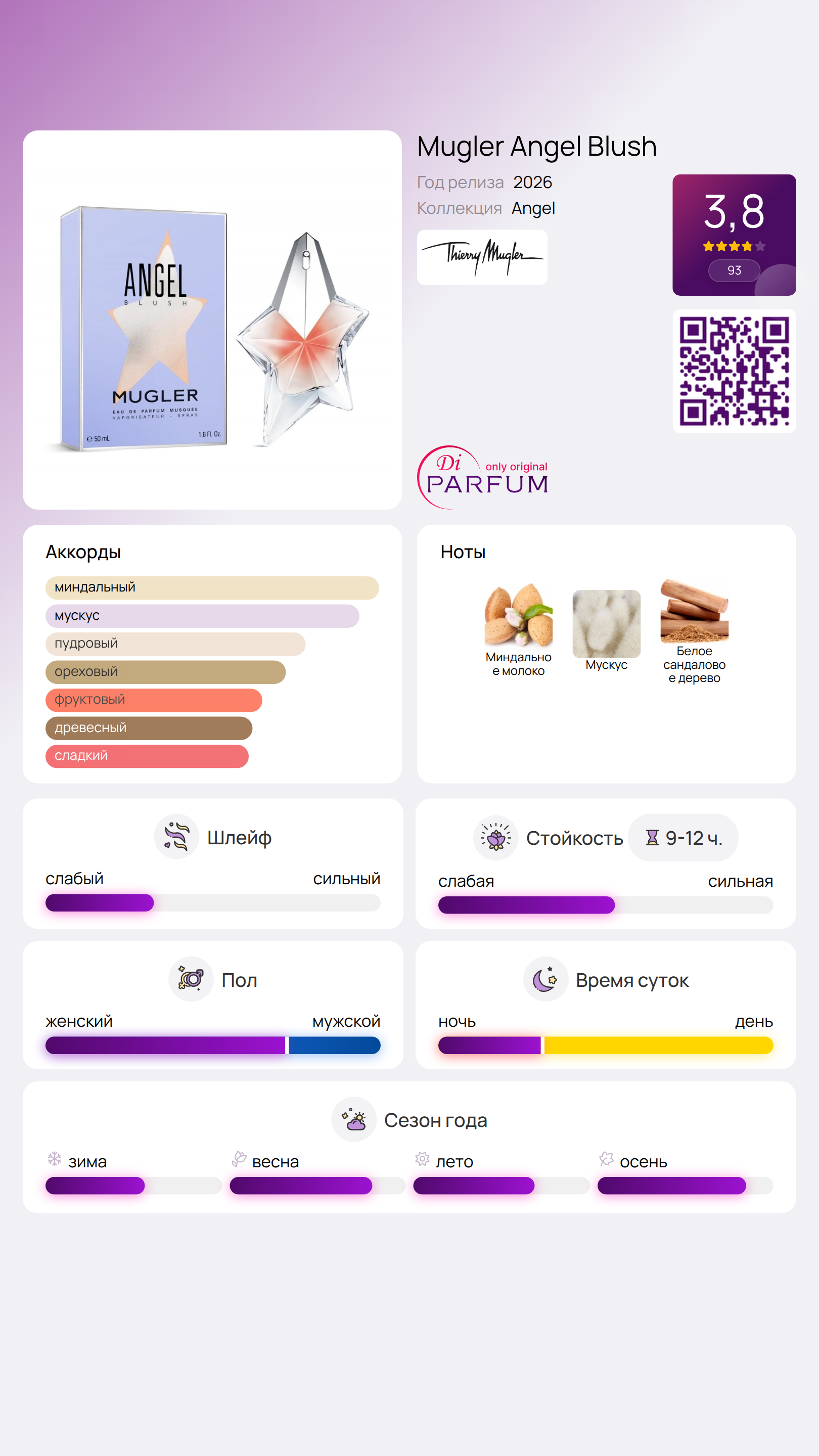 Angel Blush от Mugler — это восточно-древесный аромат для женщин. Он был представлен в 2026 году как новинка в коллекции Angel. Этот парфюм предлагает более мягкую и интимную интерпретацию гурманского стиля, характерного для линии Angel, акцентируя внимание на кремовых, мускусных и янтарных нюансах.