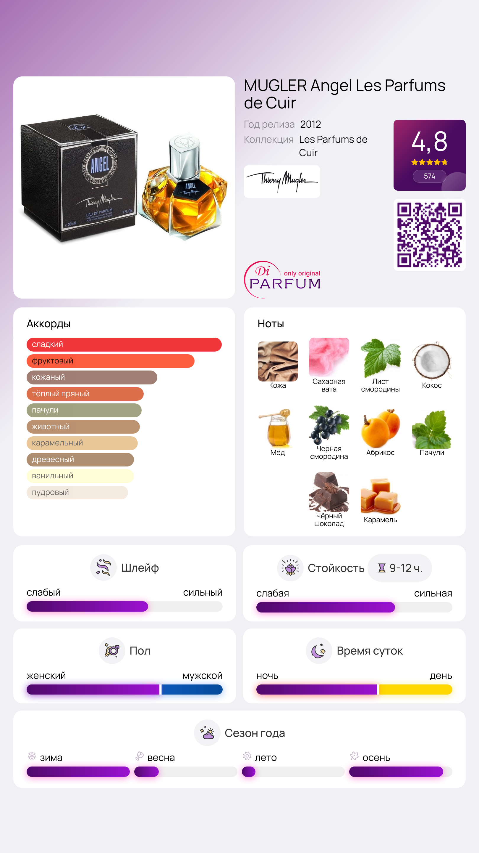 Angel Les Parfums de Cuir от Mugler — это кожаный аромат для женщин, выпущенный в 2012 году. Этот изысканный парфюм поражает своими яркими верхними нотами, в которые входят кожа, сахарная вата, кокос, дыня, жасмин и мандарин. Сердце аромата раскрывается комплексом из кожи, меда, черной смородины, абрикоса, сливы, красных ягод и цветов, создавая уникальный и многослойный шлейф. Базовые ноты формируют насыщенное сочетание кожи, пачули, темного шоколада, карамели, бобов тонка, ванили, амбры и мускуса, придавая аромату гурманский и элегантный оттенок.