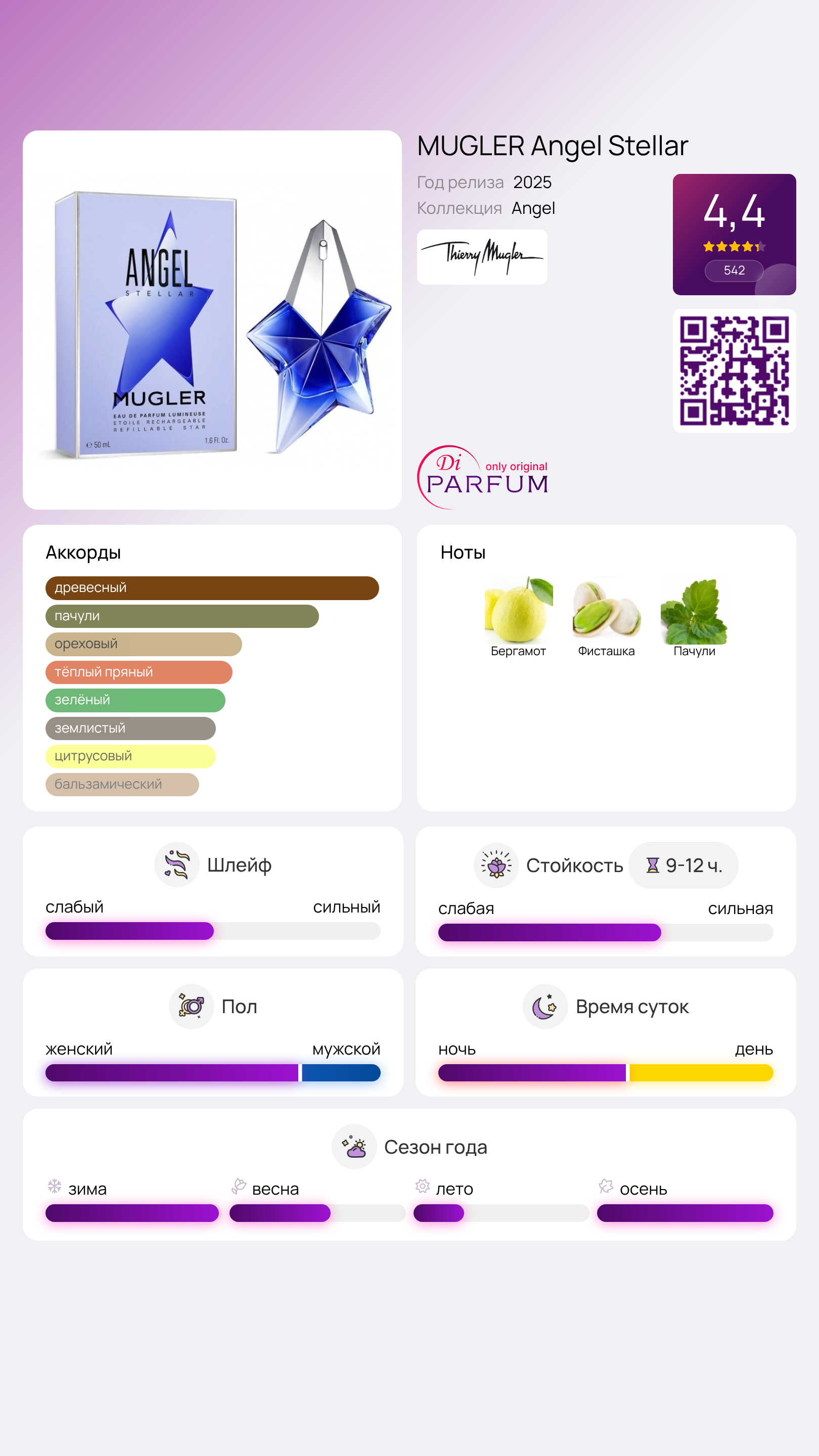 Angel Stellar идеально подходит для вечерних выходов и особых случаев, когда важно создать запоминающийся образ. Если вы ищете что-то необычное и утонченное, этот аромат станет отличным выбором для вас.