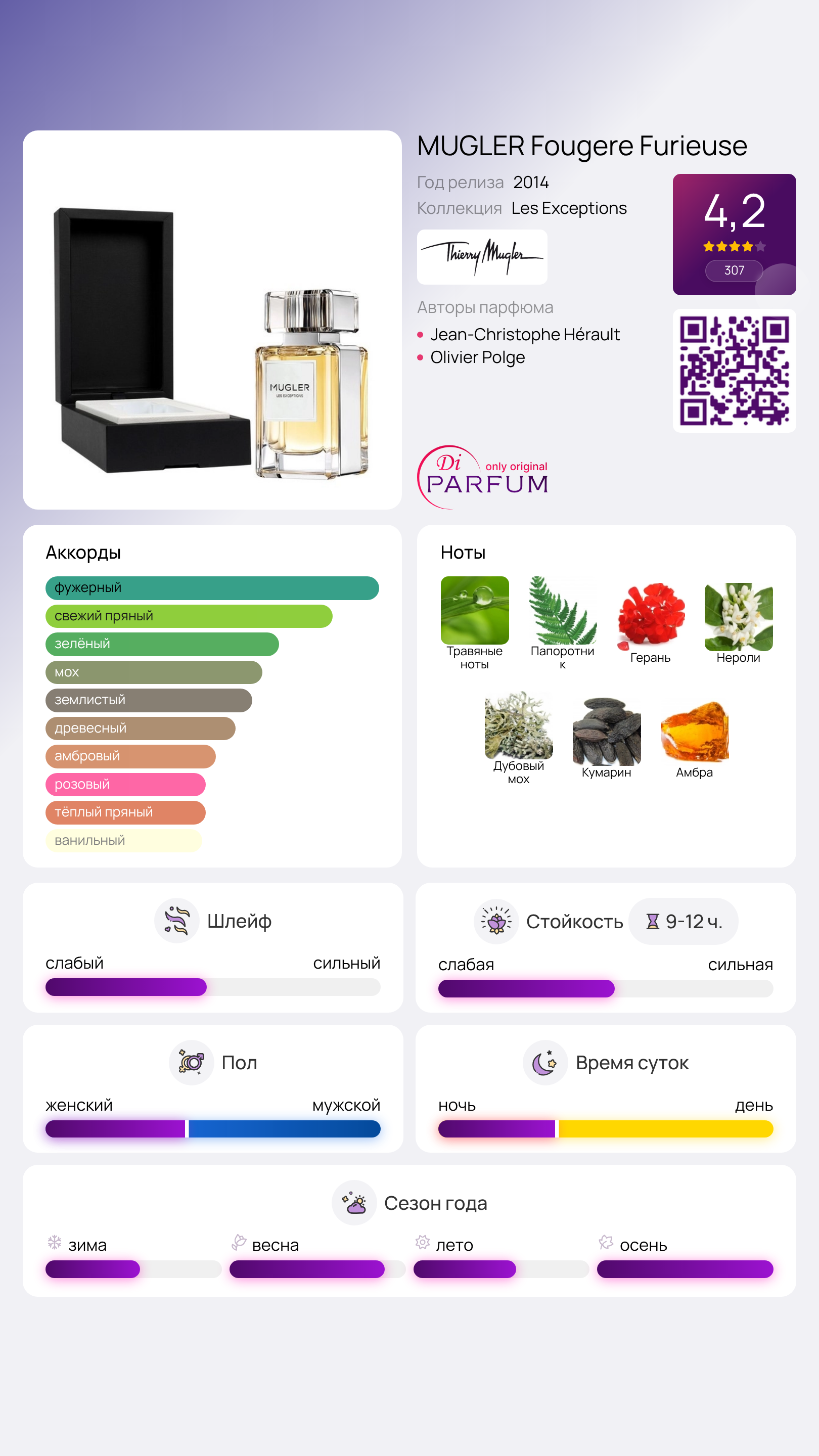 Fougere Furieuse, представленный в коллекции Les Exceptions французского бренда Thierry Mugler, представляет собой фужерный аромат, подходящий как для мужчин, так и для женщин. Его можно использовать ежедневно в офисе благодаря свежему аромату и лёгкому шлейфу, который не будет отвлекать окружающих.