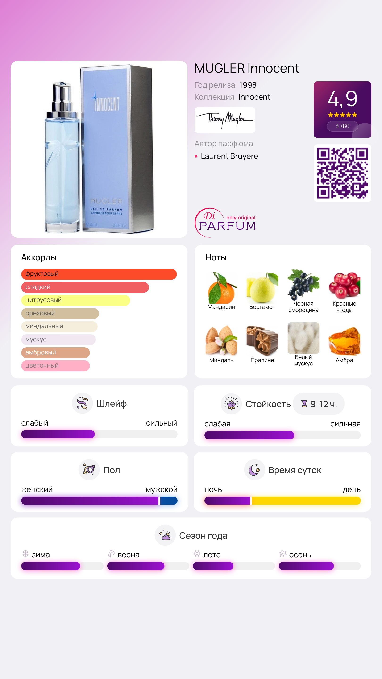 Сочетание черной и красной смородины, мускуса, миндаля и пряного меда создает сладкий букет, напоминающий нектар божественных пчел. Женщина, выбирающая Innocent, обретает одновременно ангельскую невинность и богиню изобилия, призывая к себе своей удивительной нежностью и чистотой.